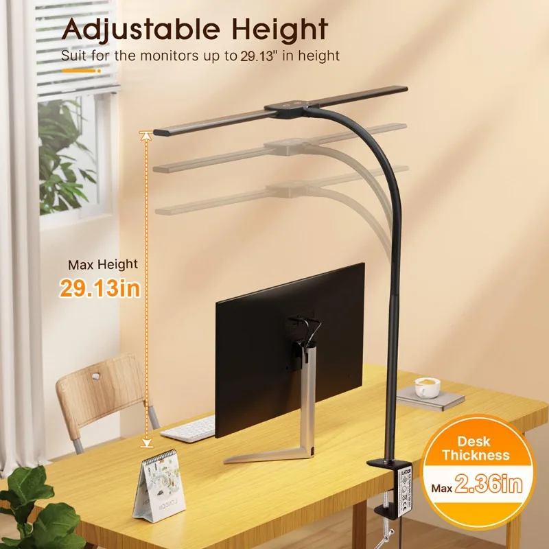 Avec deux têtes de lampe réglables, notre lampe de bureau fournit une double luminosité et une large plage d’éclairage.Si vous êtes lisant, travailler ou étudier, vous pouvez facilement ajuster les têtes de lampe pour concentrer la lumière exactement où vous avez besoin.