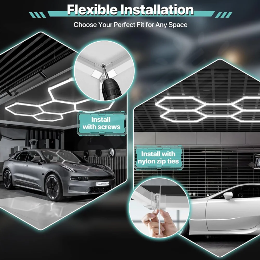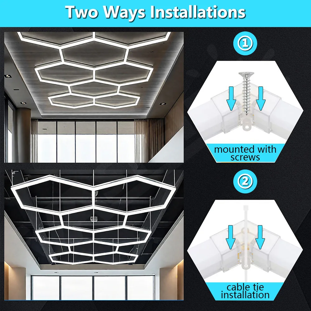 Facile à installer : votre lampe de garage hexagonale peut être installée de deux manières, à l’aide de fermetures éclair ou de vis selon vos besoins et préférences spécifiques.Cette flexibilité facilite l’installation et la personnalisation, afin que vous puissiez choisir la méthode qui convient le mieux à votre espace de garage.Que vous préfériez utiliser des vis pour une installation plus permanente ou des fermetures éclair pour une installation plus flexible, nos lumières de garage hexagonales peuvent répondre à vos préférences et exigences uniques.
