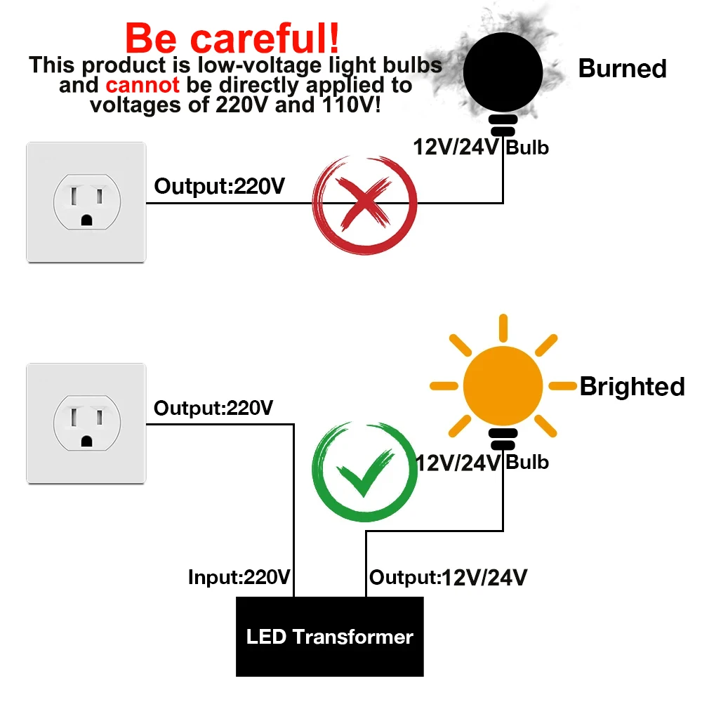 REMARQUE: Ne pas utiliser directement 110V-220V, il explosera. Si votre tension est de 110V-220V, veuillez utiliser un transformateur pour changer la tension.