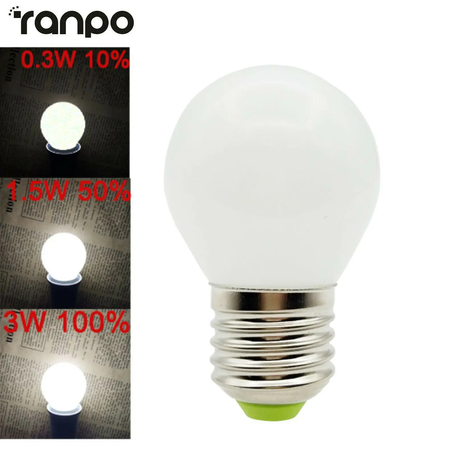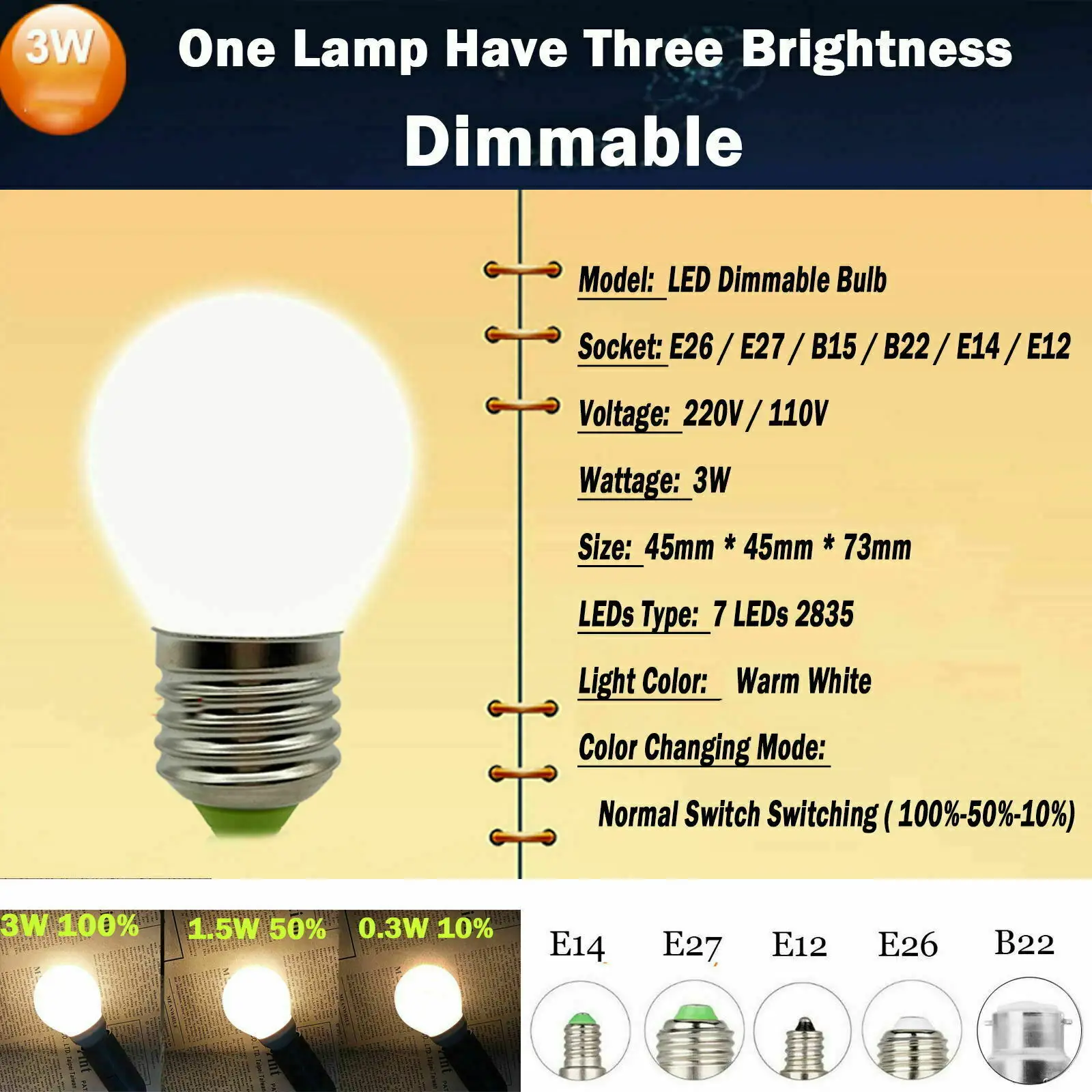 -Gradation à trois niveaux: 3W (100%) – 1.5W (50%) – 0.3W (10%) -Une ampoule contient trois niveaux de luminosité. La luminosité est commutée par un interrupteur ordinaire. -3W est équivalent à une lampe à incandescence de 30W.