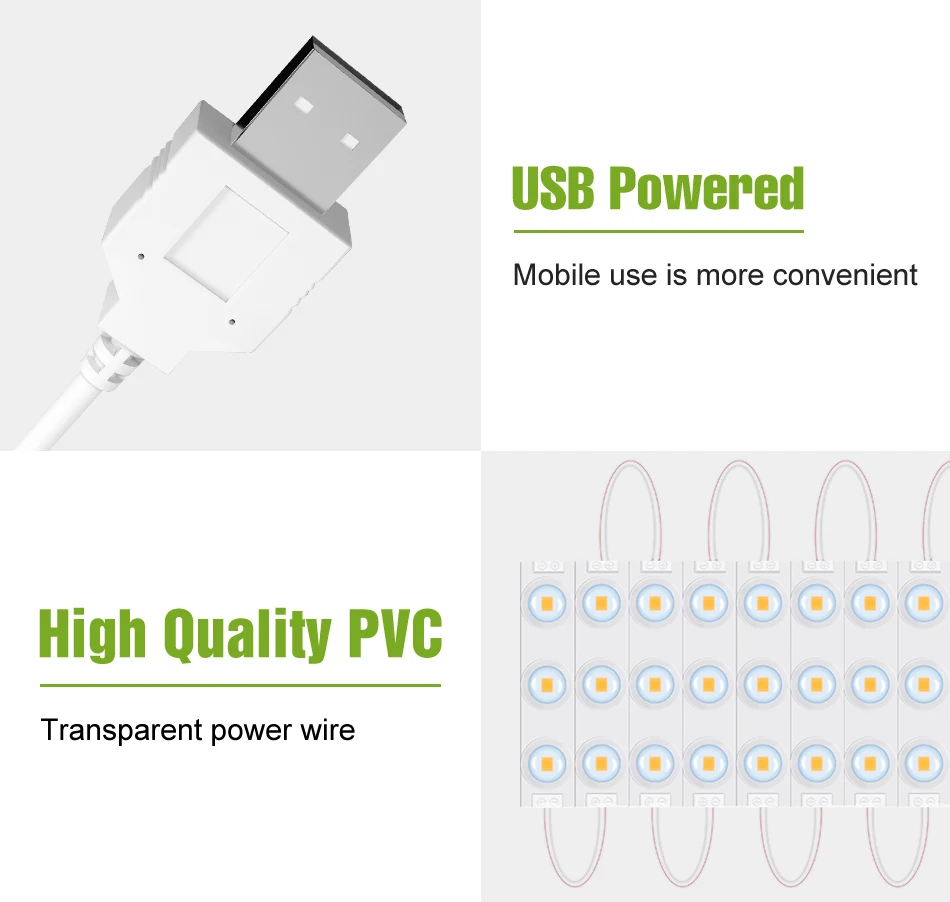 *Le port USB, les ampoules et l’alimentation peuvent être connectés par USB de plusieurs façons, telles que l’ordinateur portable, la banque d’alimentation, la prise, il est donc très pratique lors de l’utilisation.