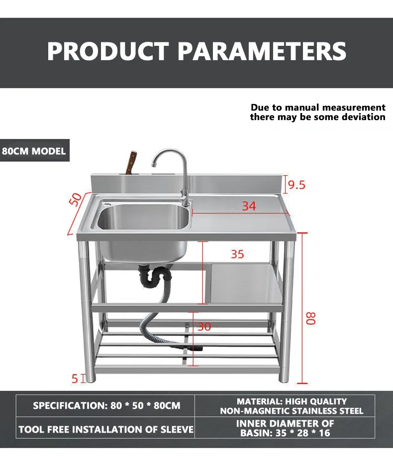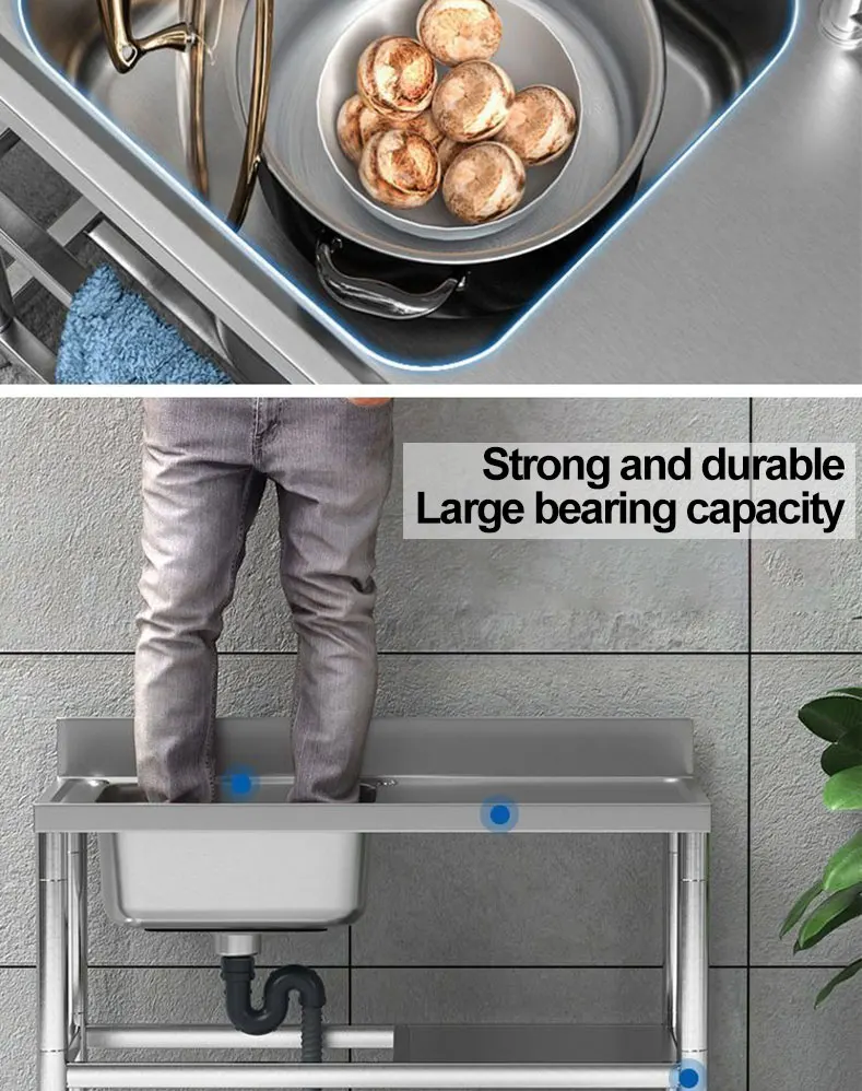 【Conception stable et conviviale】 Les pieds d’équilibrage réglables maintiennent l’évier stable sur les sols inégaux, tandis que les bords lisses en forme d’arc évitent les blessures accidentelles. La conception autoportante facile à assembler ne nécessite aucun outil, ce qui la rend conviviale pour les cuisines, les salles de bains, les buanderies, les garages et les espaces extérieurs.
