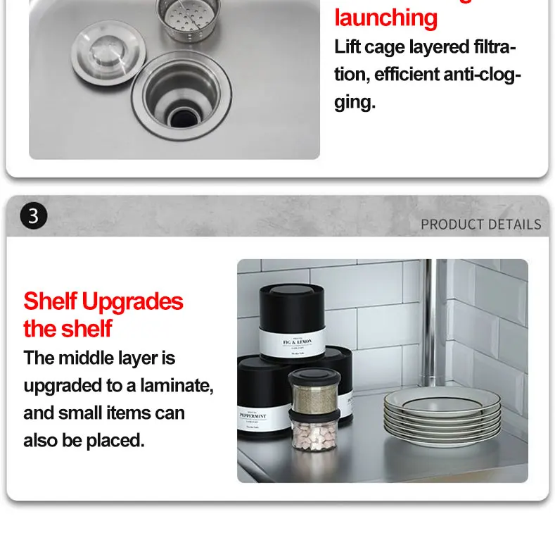 【Système de drainage efficace】 Livré avec une unité de drainage en acier inoxydable et un filtre amovible pour éviter le colmatage.Le système de drainage efficace assure un débit d’eau rapide, réduisant ainsi l’accumulation et maintenant l’hygiène.Le backsplash protège les murs et empêche les objets de tomber.