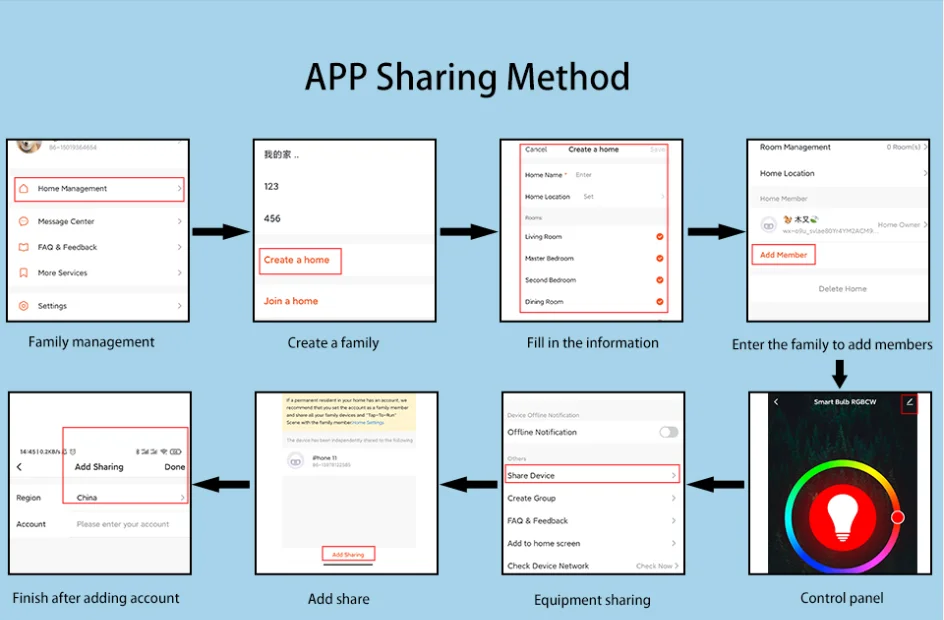【Groupe et Partage】Partager le contrôle de l’ampoule avec la famille et les amis pour contrôler les lumières ensemble. Vous pouvez installer un groupe pour les ampoules, vous pouvez commander les ampoules en même temps
