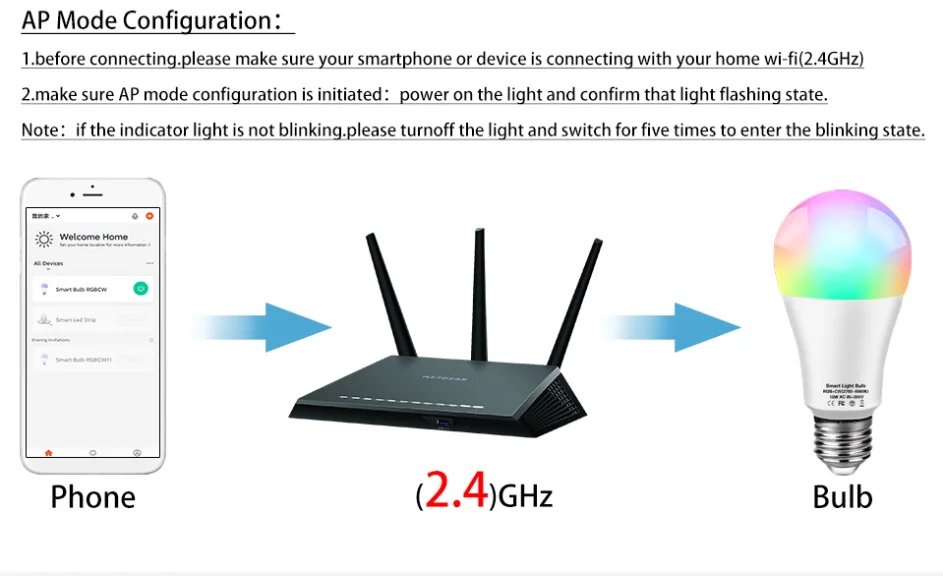 2. Assurez-vous que la configuration du mode AP est lancée: allumez la lumière et confirmez l’état de clignotement de la lumière.