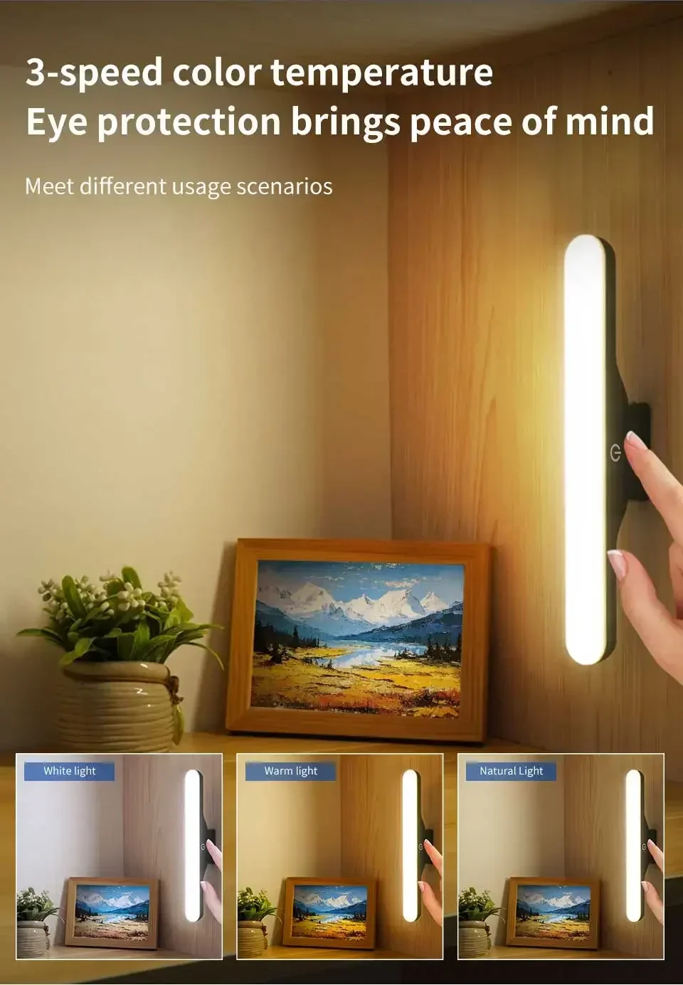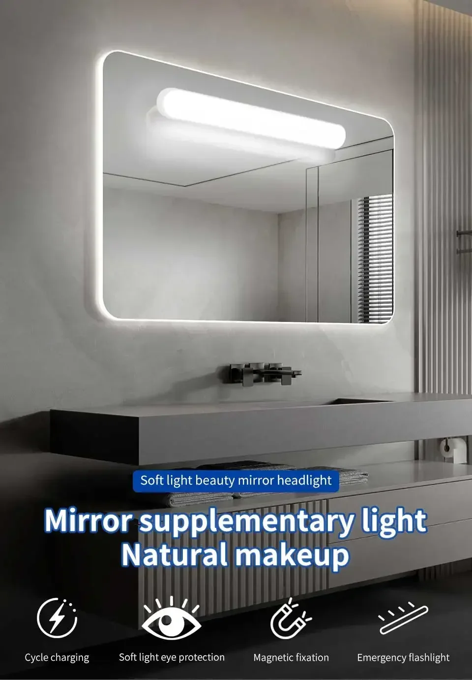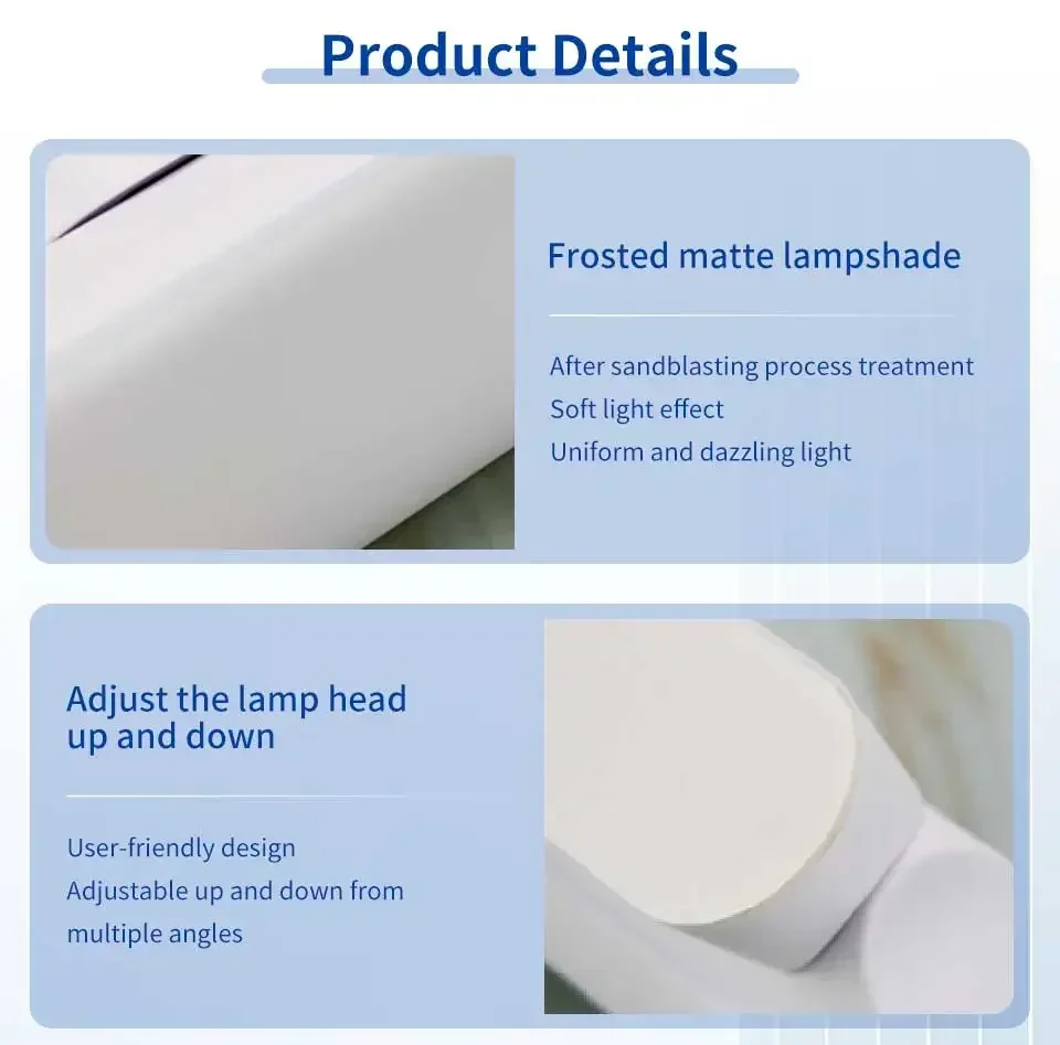 En tant que lumière complémentaire devant le miroir, il peut vous fournir une lumière uniforme, douce et vive lorsque vous entretenez, de sorte que chaque détail de votre visage soit clairement visible et que vous puissiez montrer la version la plus parfaite de vous-même. En même temps, elle peut également devenir une lampe de lecture pour prendre soin de vos yeux. À la tombée de la nuit, elle peut également être utilisée comme lampe de chevet douillette pour vous accompagner dans un doux rêve.