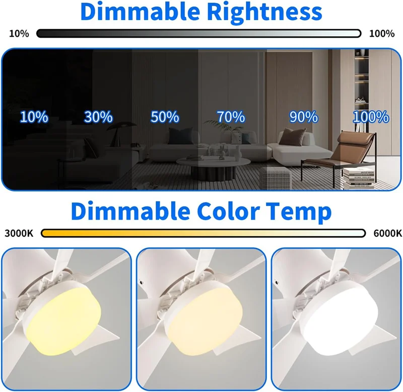 Lampe de ventilateur de plafond télécommandée, pales de ventilateur amovibles, design 2 en 1, ventilateur et lumière LED, avec télécommande pour un usage plus pratique.Température de couleur 3000K-6500K, prend en charge la température de la couleur et le réglage de la luminosité.
