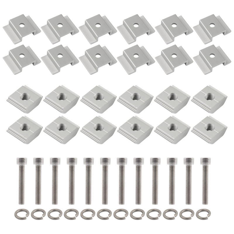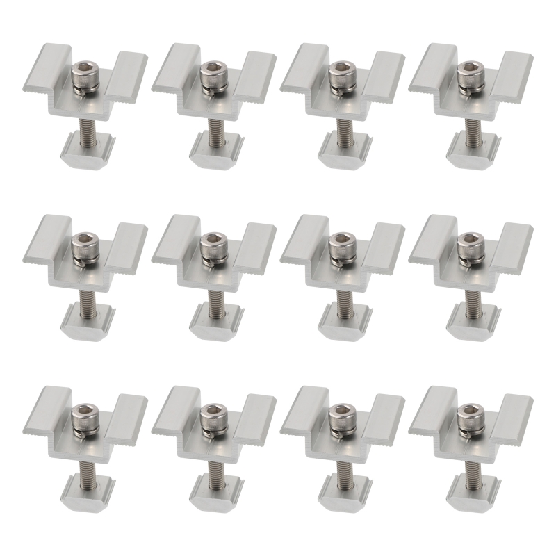 Lot douze pinces centrales panneaux solaires serrage moyen alliage aluminium anodisé résistant corrosion UV antidérapant concave convexe inoxydable compatibilité railsLot douze pinces centrales panneaux solaires serrage moyen alliage aluminium anodisé résistant corrosion UV antidérapant concave convexe inoxydable compatibilité rails