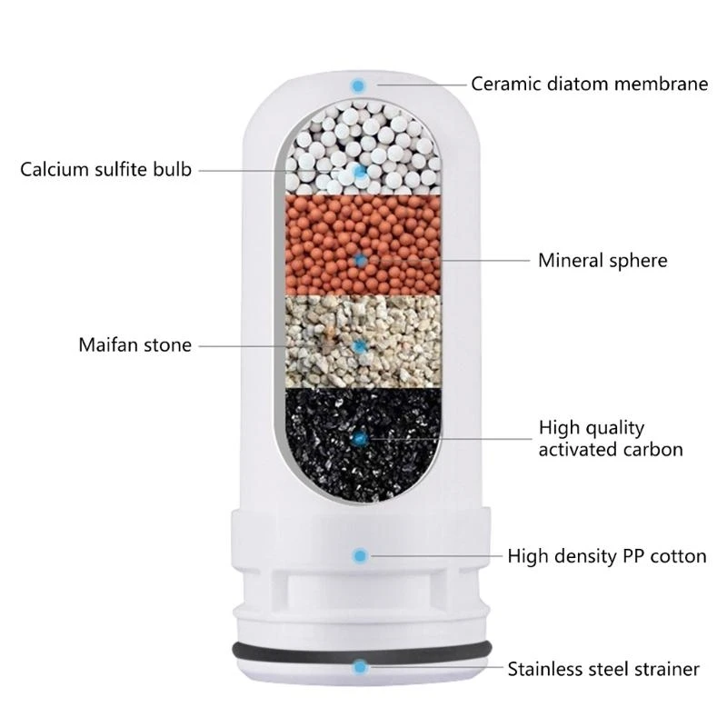 Notre filtre en membrane céramique de Diatomite, coquilles de noix de coco ont des granulés de carbone activés, filtre efficacement les écailles d’eau, les sédiments, les flotteurs, les odeurs, la rouille, certains résidus de chlore et les grosses particules.