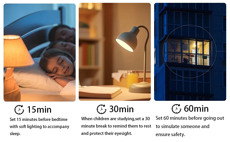 Fonction de synchronisation : ce produit dispose également d’une fonction de synchronisation, comprenant trois réglages de temps de 15 minutes, 30 minutes et 60 minutes, vous permettant de vous reposer ou de travailler sans vous soucier d’éteindre les lumières.