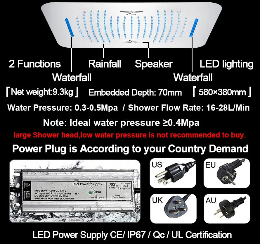 - LED Shower heads Install: Embedded Ceiling Mounted