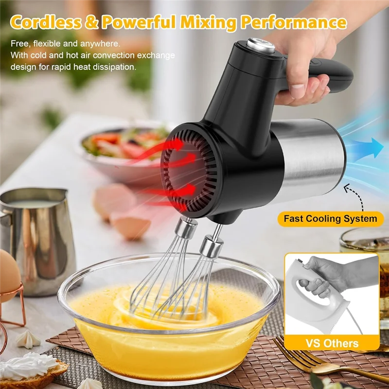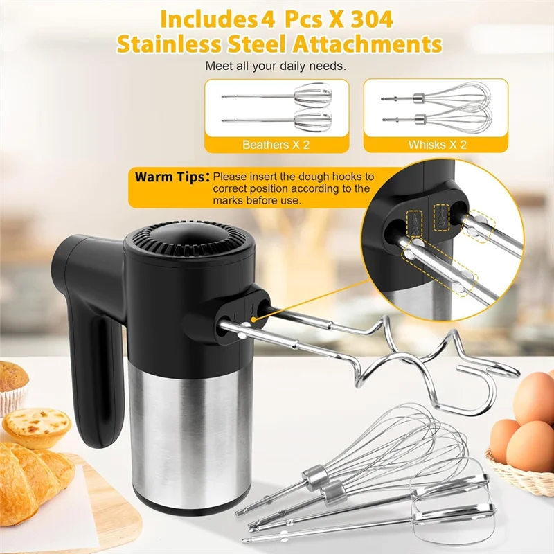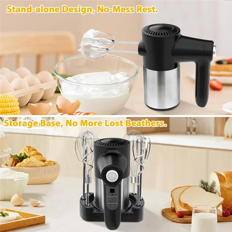 [STORAGE BASE & STAND-ALONE DESIGN] – Comes with a convenient base station to neatly store the mixer and all attachments. The stand-alone design keeps the mixer upright and your counters clean during breaks, ensuring a tidy workspace.