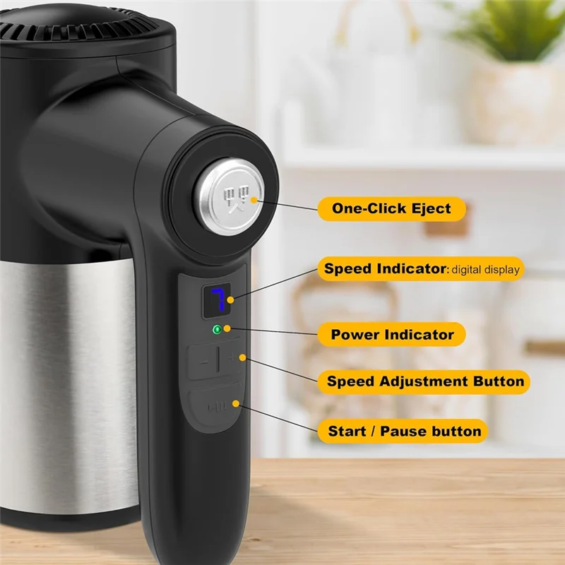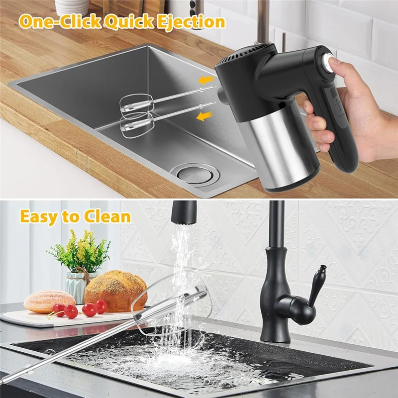 [ONE CLICK EJECT & EASY CLEAN] – Features a one-click eject button for quick attachment changes and easy cleaning. Ensure the mixer is set to ‘0’ speed for safe ejection. The ergonomic handle provides a comfortable grip, enhancing ease of use.