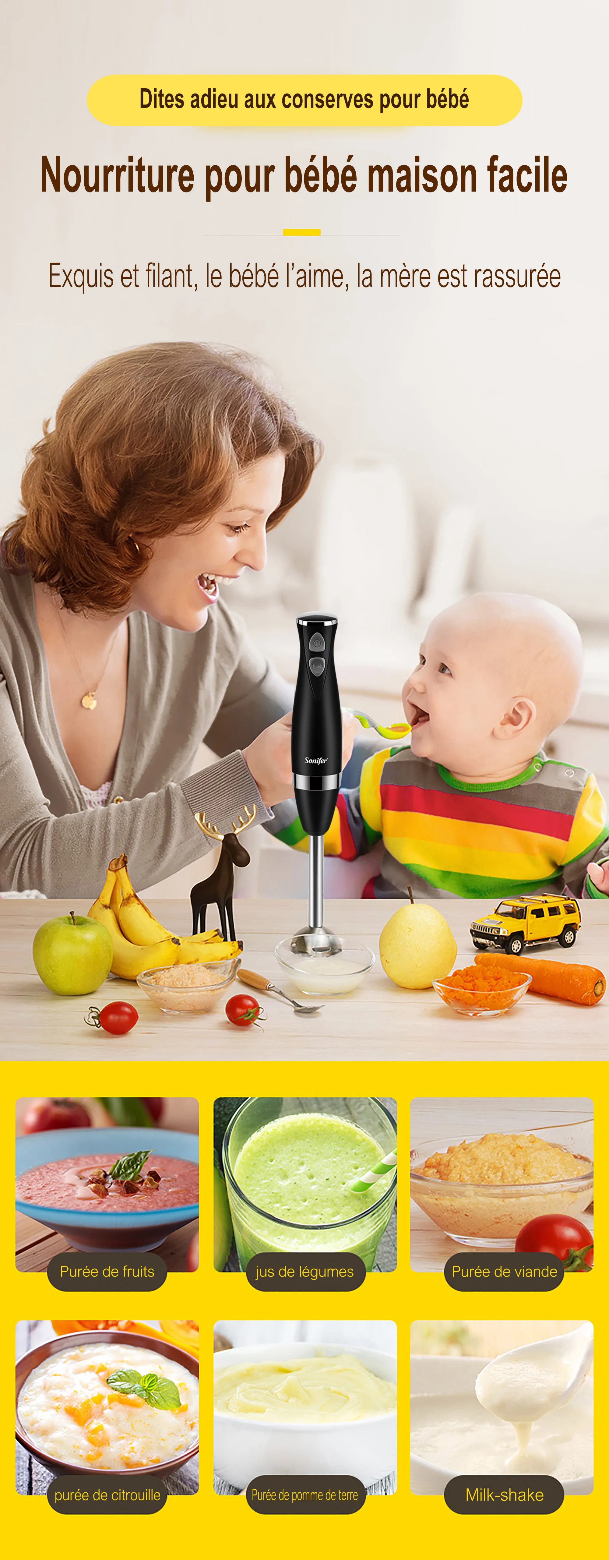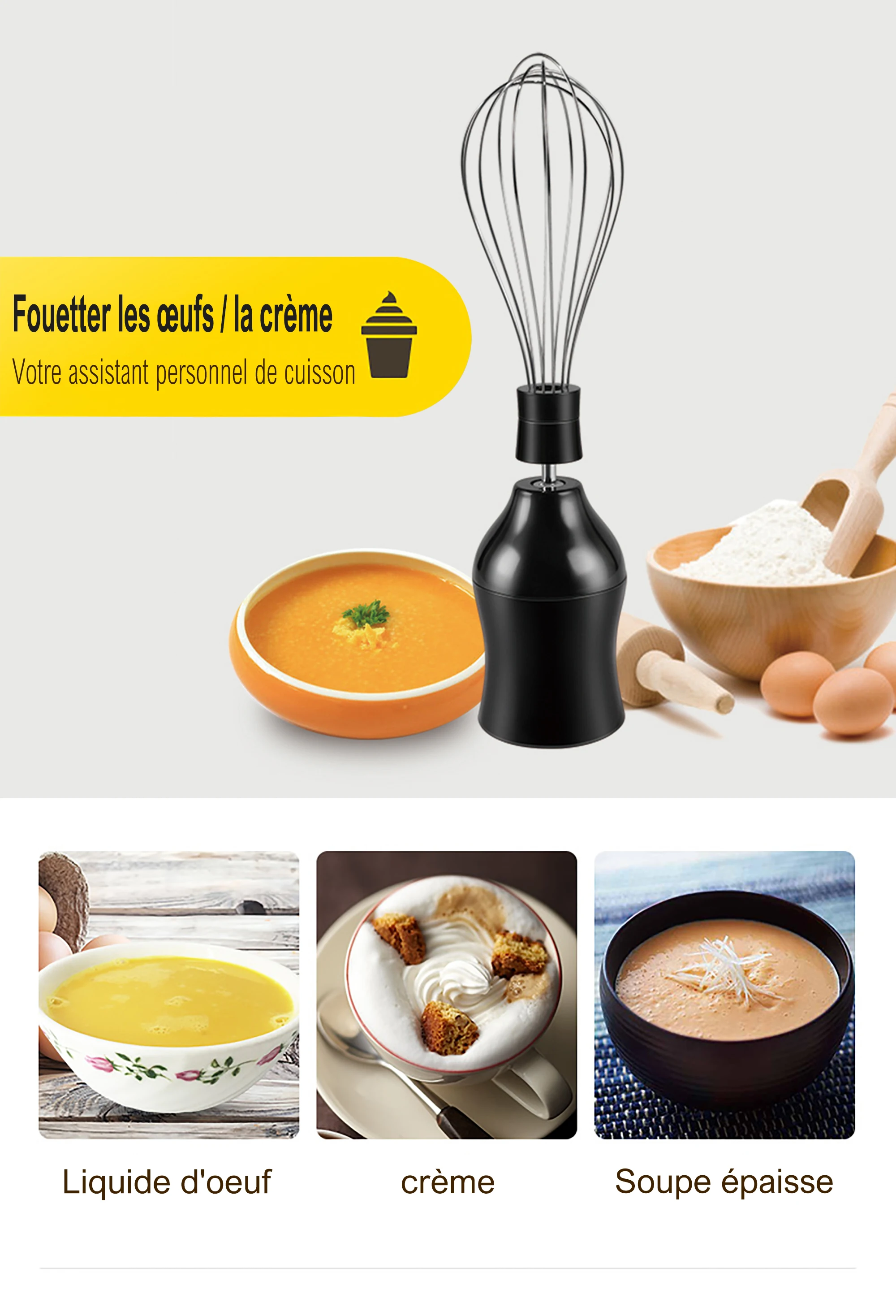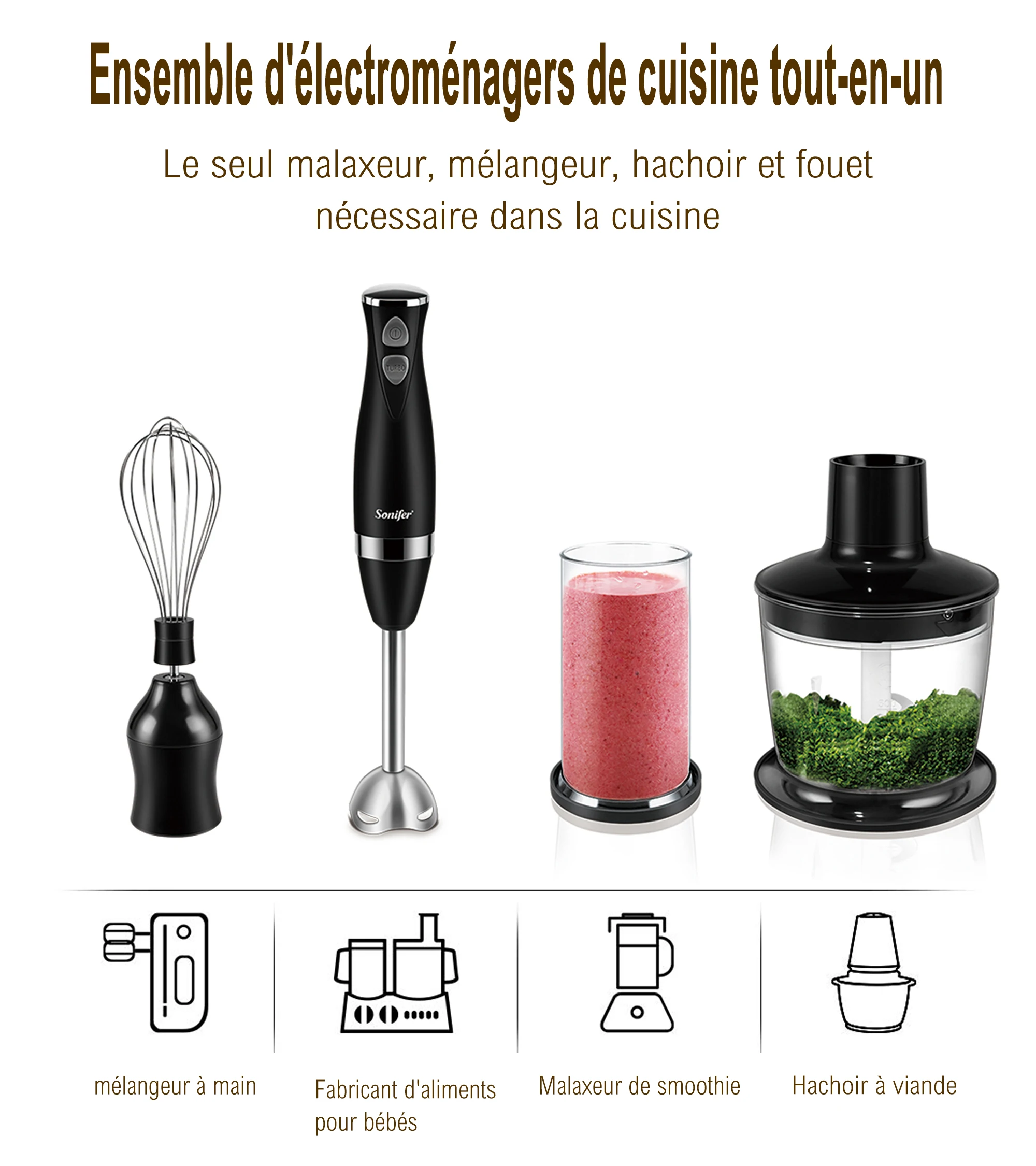 "Ce mélangeur à main électrique est tout simplement fantastique ! J'adore sa polyvalence avec ses différents accessoires qui permettent de mixer, hacher et fouetter facilement. La construction en acier inoxydable le rend très robuste et facile à nettoyer. La seule petite ombre au tableau est que le mélangeur est un peu bruyant à l'utilisation, mais cela n'entache en rien ses performances. Je le recommande vivement à tous ceux qui cherchent un outil de cuisine multifonctions de qualité."