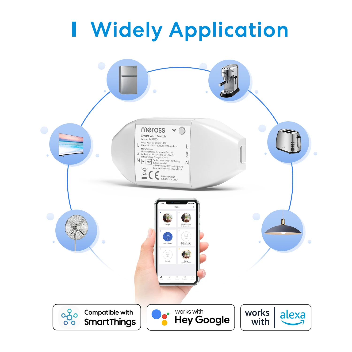 Contrôlez votre lumière et vos luminaires partout et à tout moment via l’application Meross, Amazon Alexa,Google Assistant et SmartThings.
