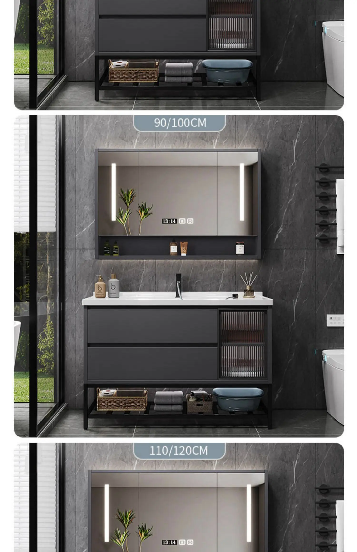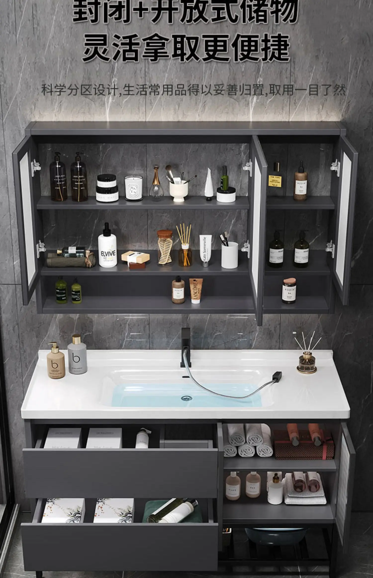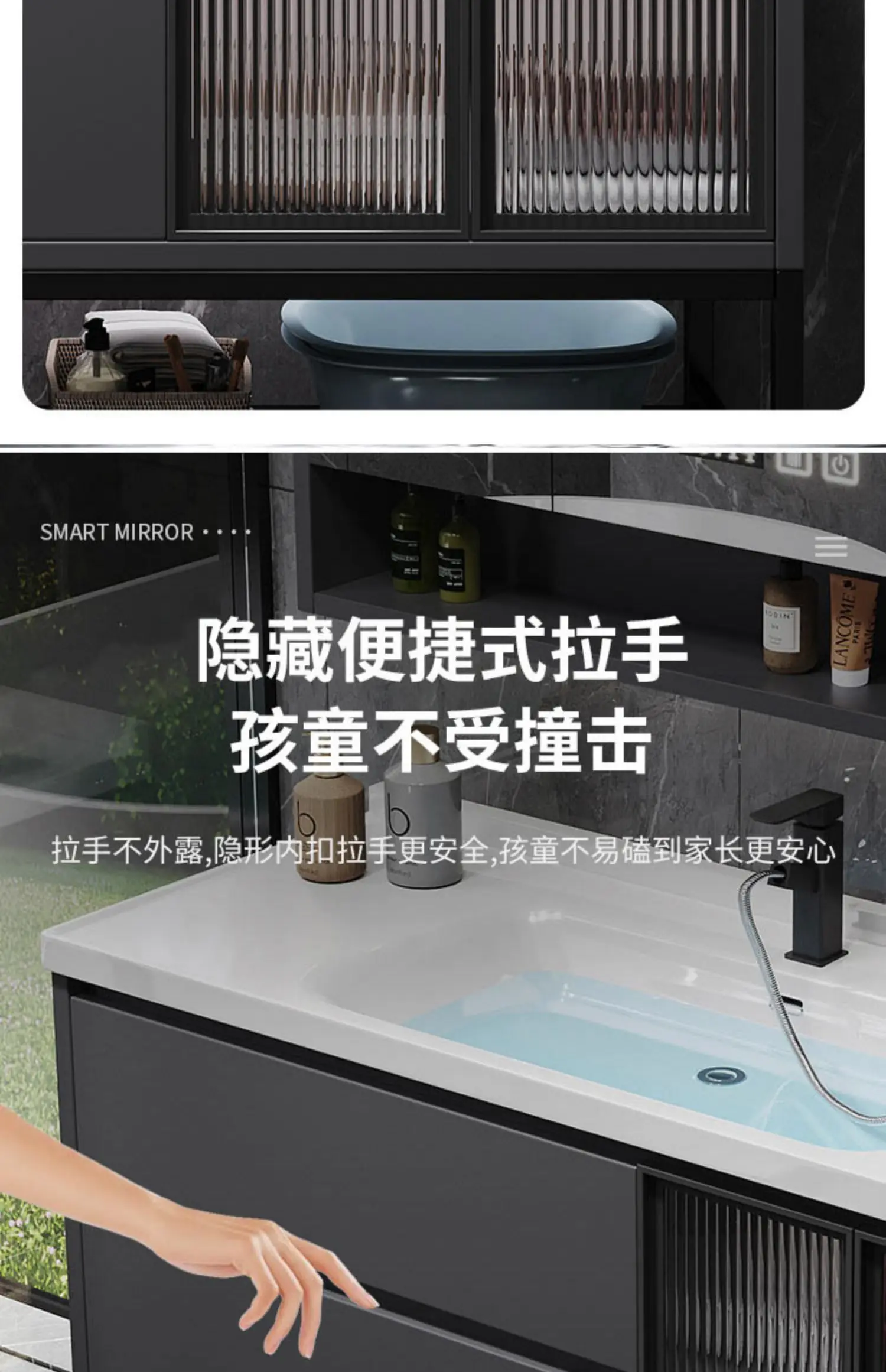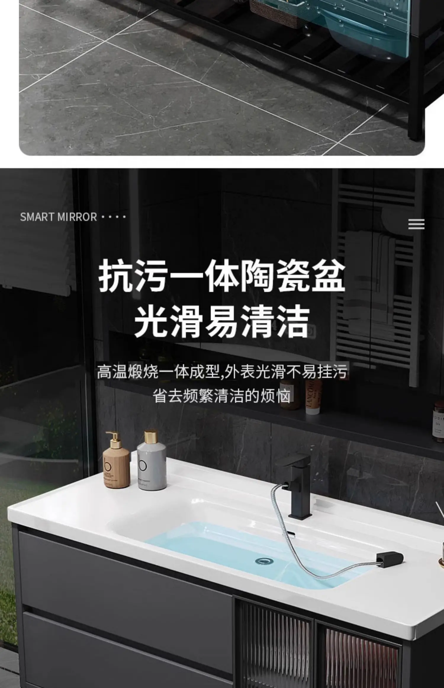 - Basin structure: Main cabinet + smart storage mirror cabinet