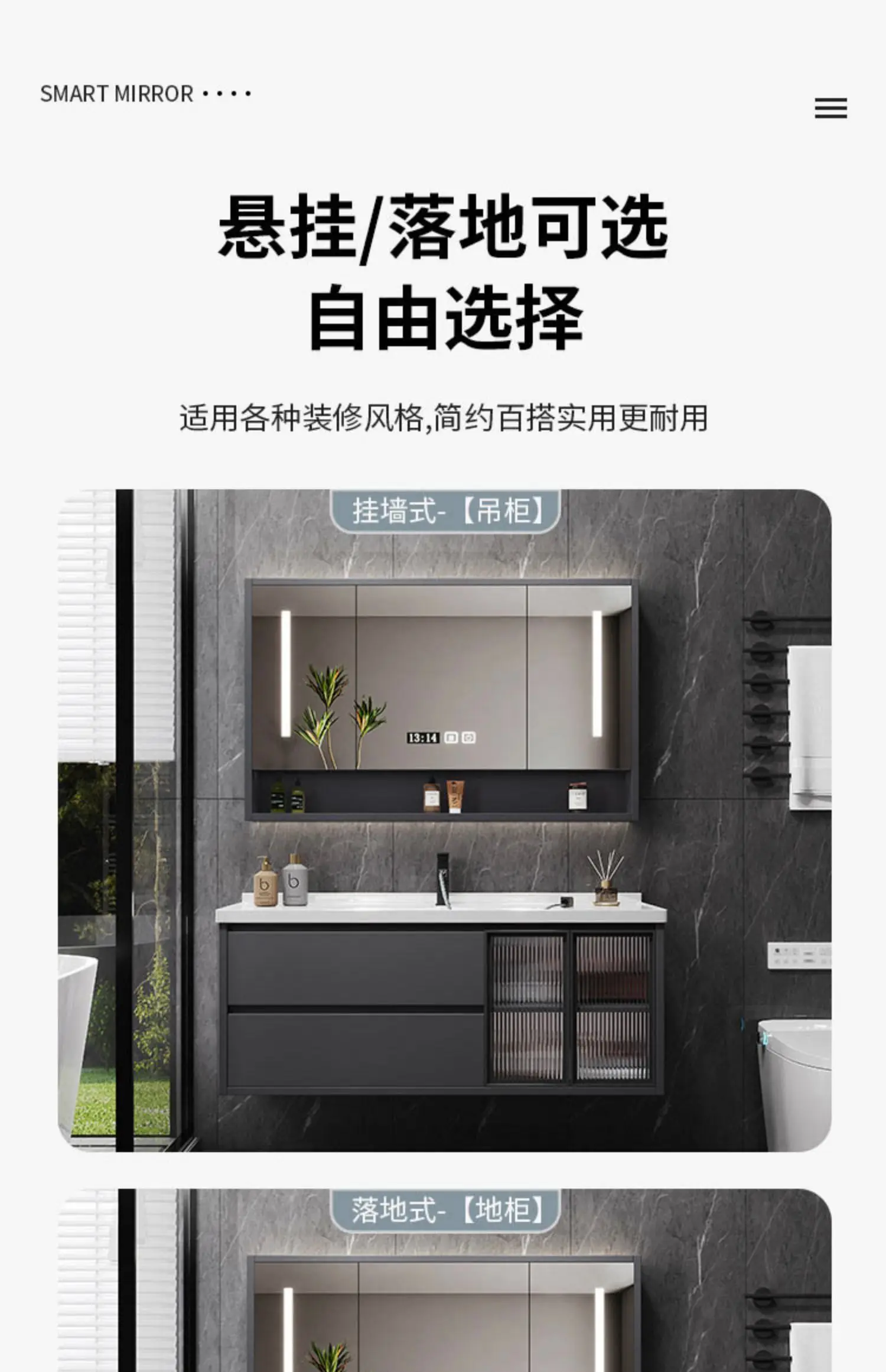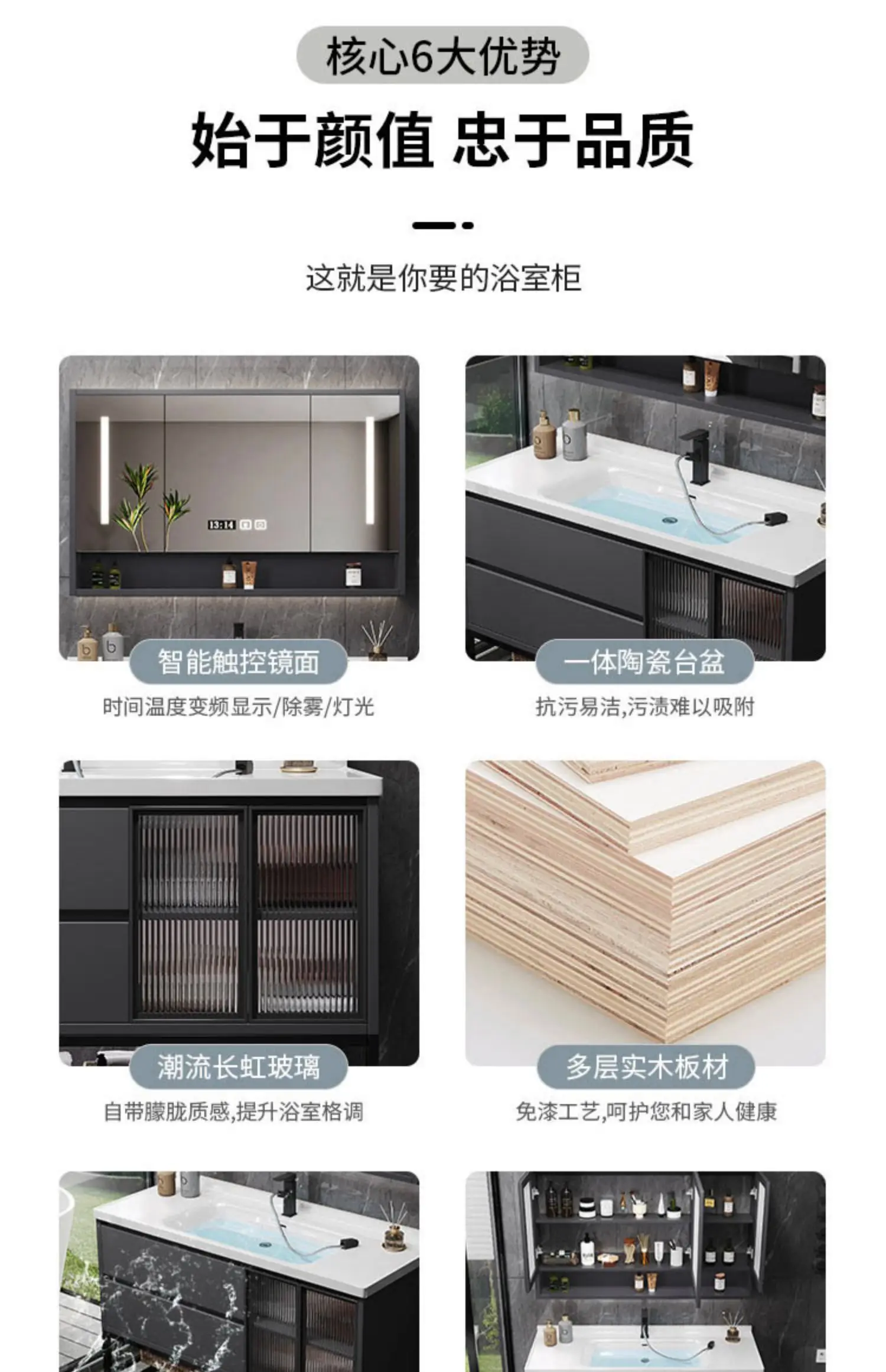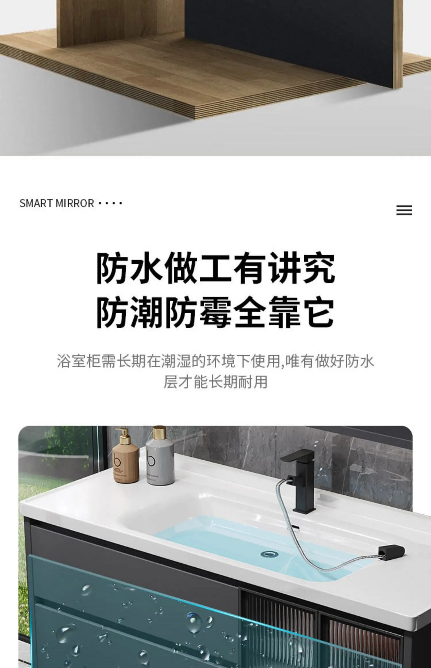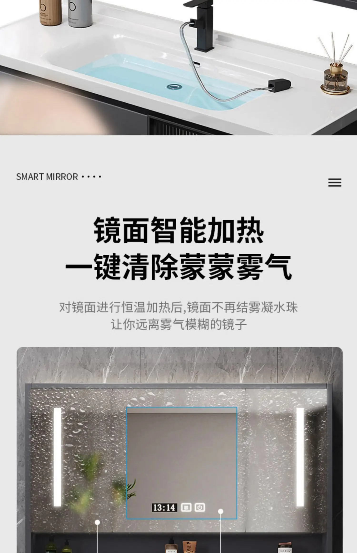- Basin structure: Main cabinet + smart storage mirror cabinet
