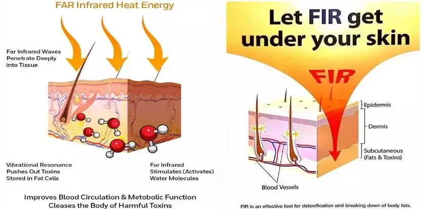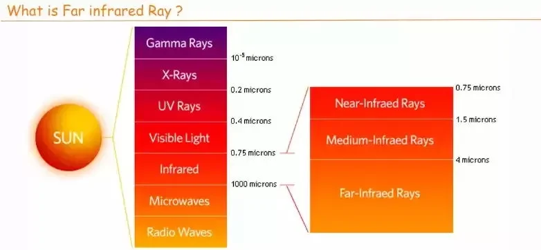 La lumière du soleil contient diverses vagues de fréquence lumineuse.L’absorption normale de la fréquence résonante pour le corps humain est de 4 à 14 um.Cette bande d’onde de fréquence est appelée de l’onde infrarouge lointaine, elle peut pénétrer le corps humain de 2 à 3 um, cette pénétration améliore la circulation corporelle et soulève la température corporelle.