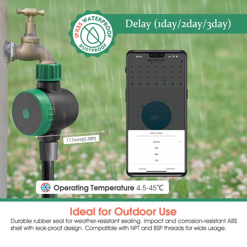 🌱Options d’alimentation et délai de pluie :La minuterie Bluetooth est alimentée par 2 piles alcalines AA, offrant jusqu’à 6 mois d’utilisation.La minuterie maintient une connexion solide avec une portée en champ ouvert allant jusqu’à 15 mètres (49,2 pieds).Pour plus de commodité pendant les périodes de pluie, la fonction de retard de pluie vous permet de définir un délai d’arrosage de 24, 48 ou 72 heures directement depuis l’application, garantissant que les plans d’arrosage sont ajustés en conséquence.