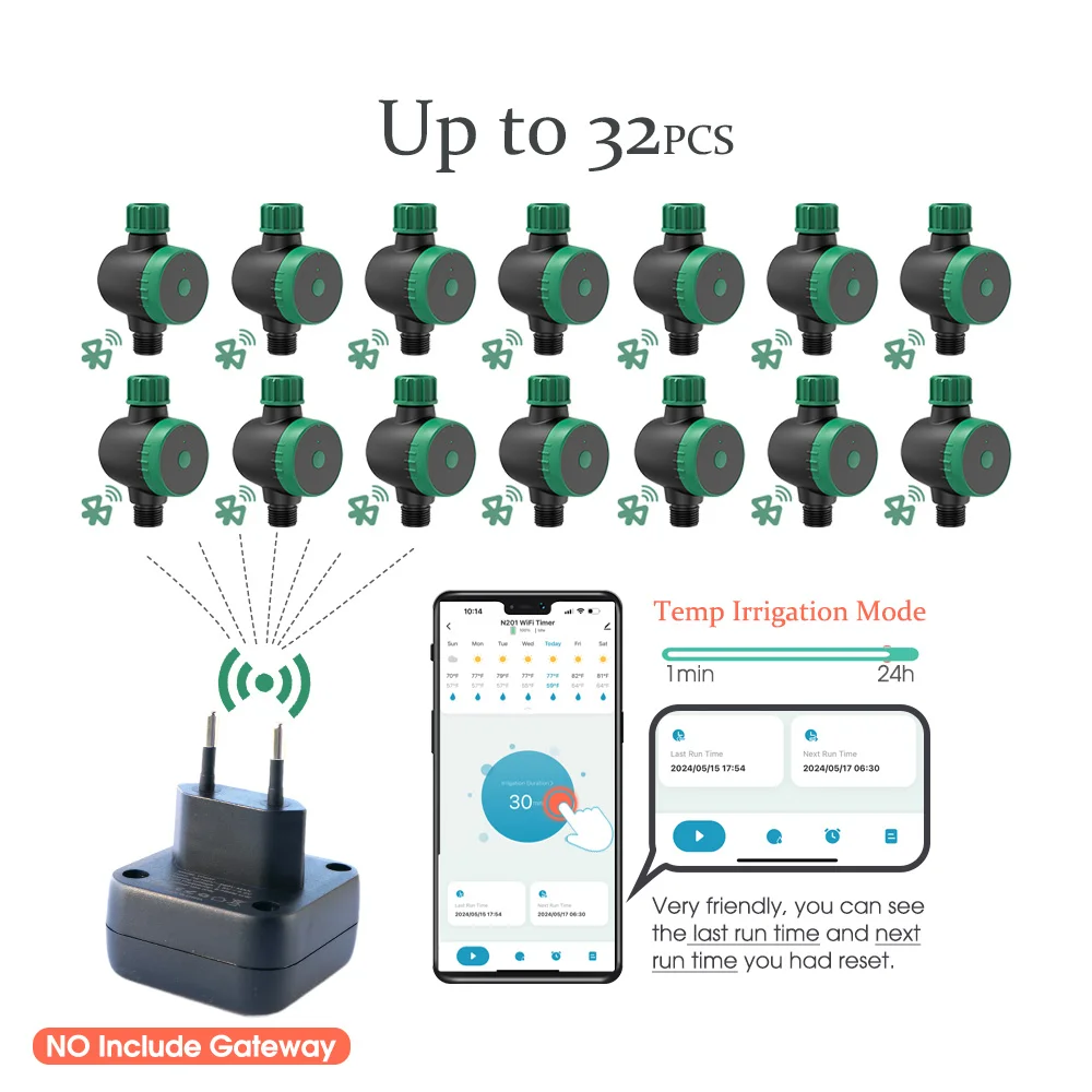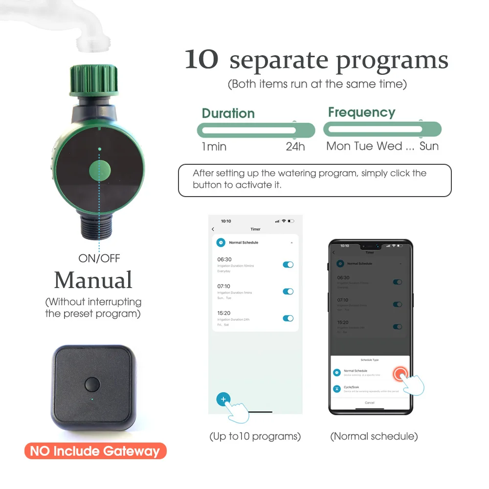 🌱Trois modes d’irrigation polyvalents :(1) Irrigation temporaire : activer ou désactiver l’arrosage utilisant le bouton ON/OFF sur la minuterie ou le bouton d’irrigation temporaire sur l’application sans altrant vos programmes pré-ensemble.(2) Mode chronométré : crée jusqu’à 10 programmes indépendants, chacune avec des durations d’arrosage personnalisables tenant de 1 minute à 24 heures et des réglages de fréquence flexibles du lundi au dimanche.(3) Mode chronométré cyclique : jusqu’à 10 jeux peuvent être programmés pour répéter l’irrigation dans une période de temps spécifiée.Par exemple, vous pouvez configurer la minuterie d’eau pour 5 minutes et pause pendant 10 minutes entre 10 AM et 1 PM sur les jours sélectionnés.Cette mode est idéale pour les besoins d’irrigation précis, comme pour les pelouses, les jardins ou les piscines.