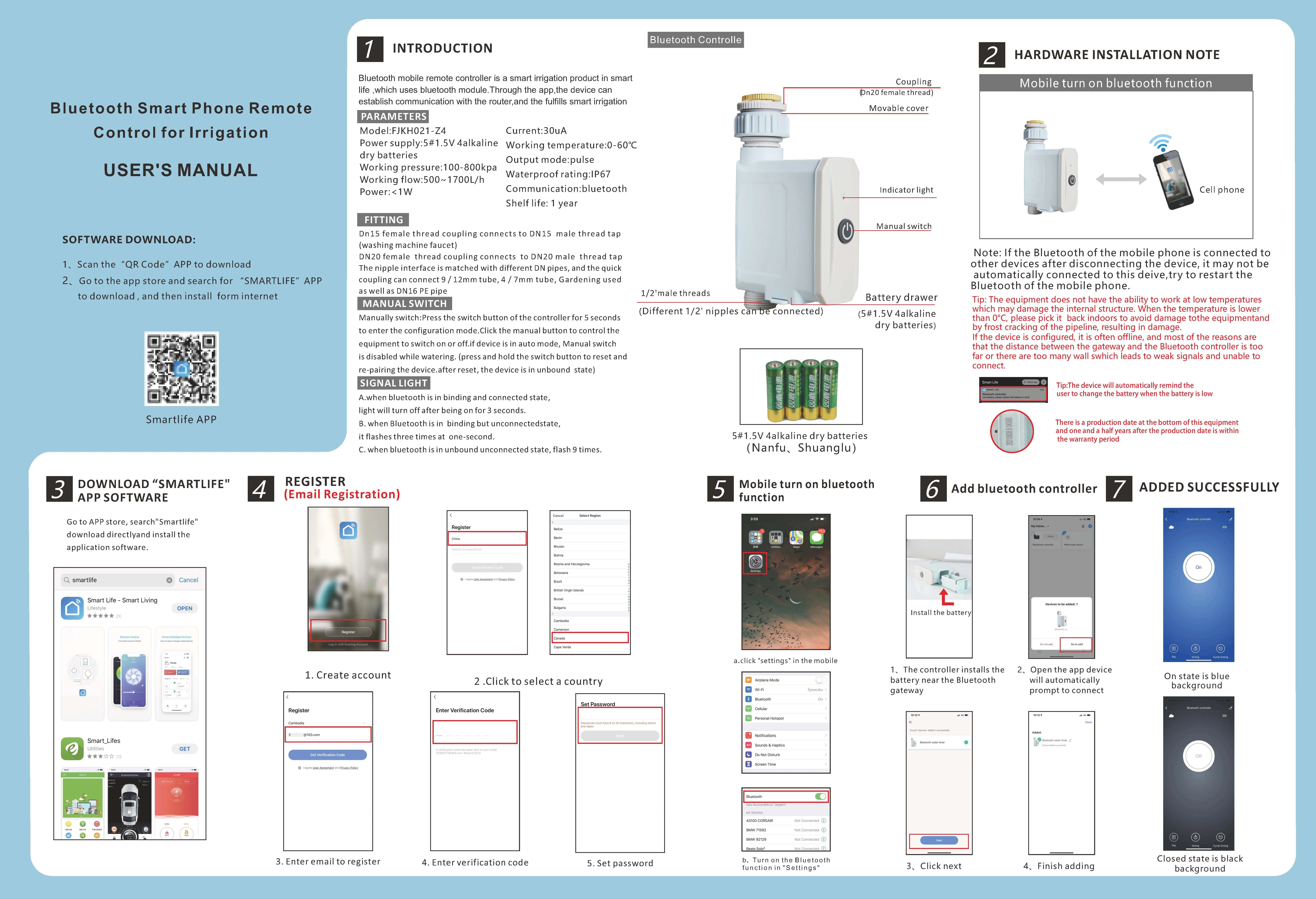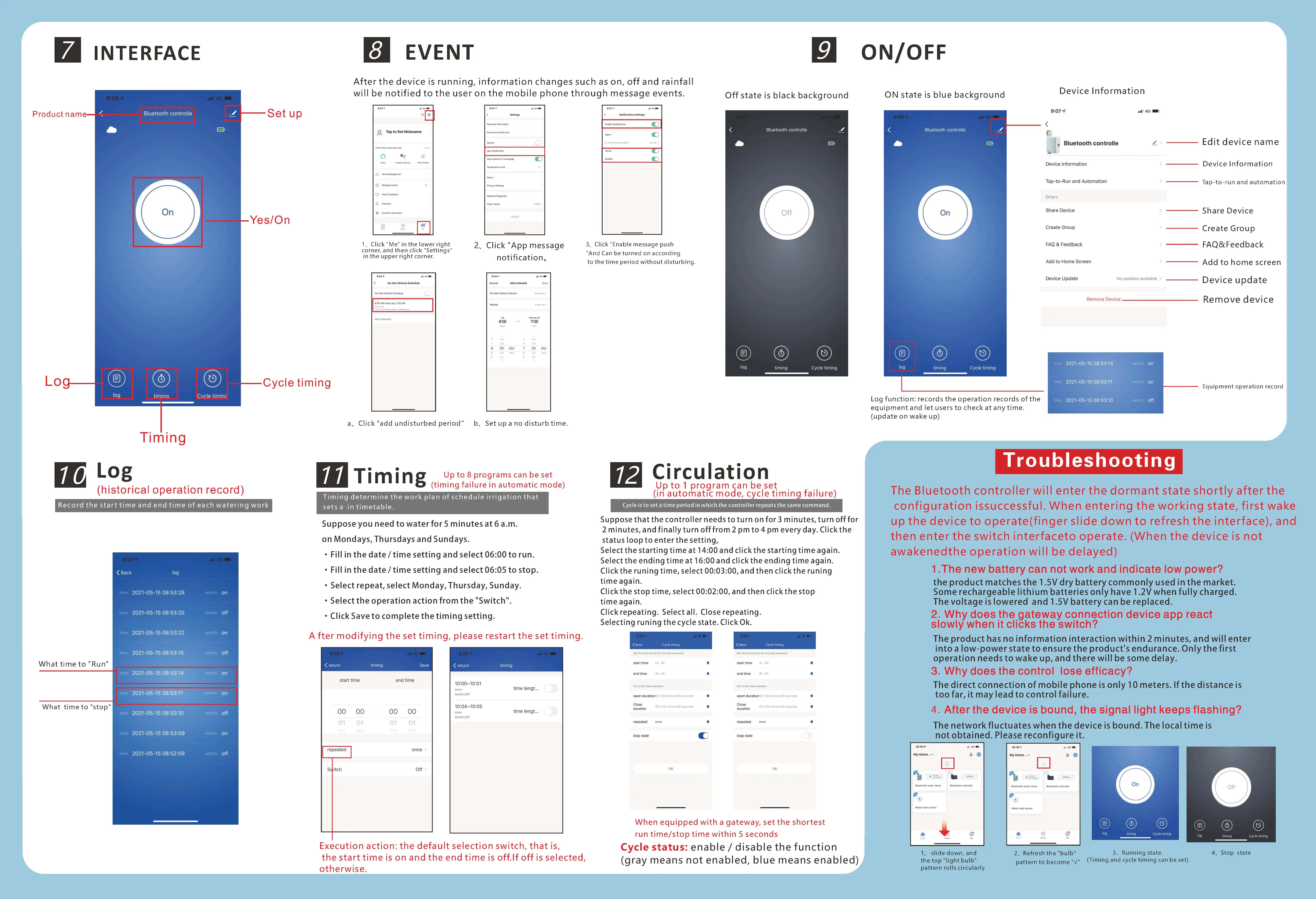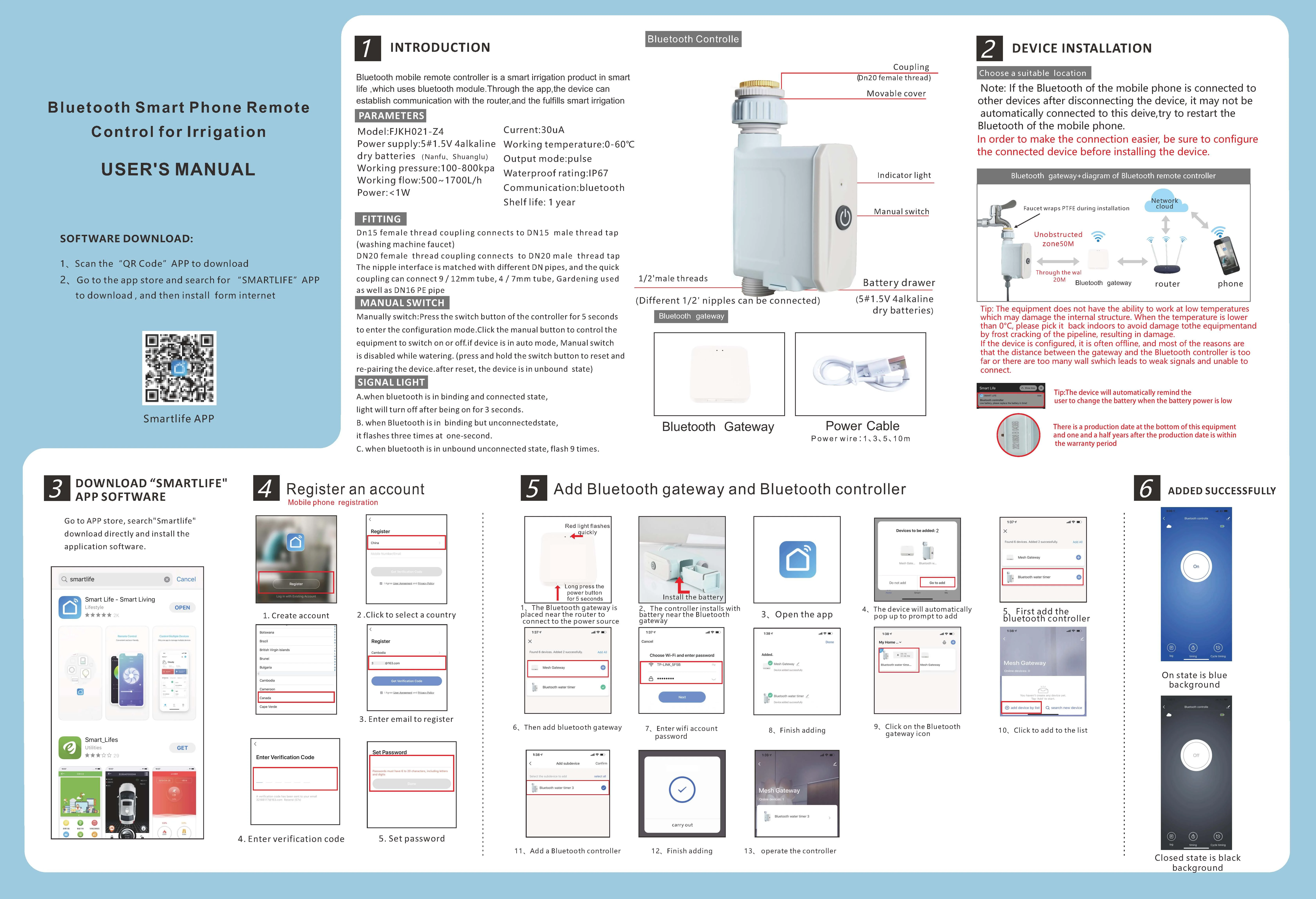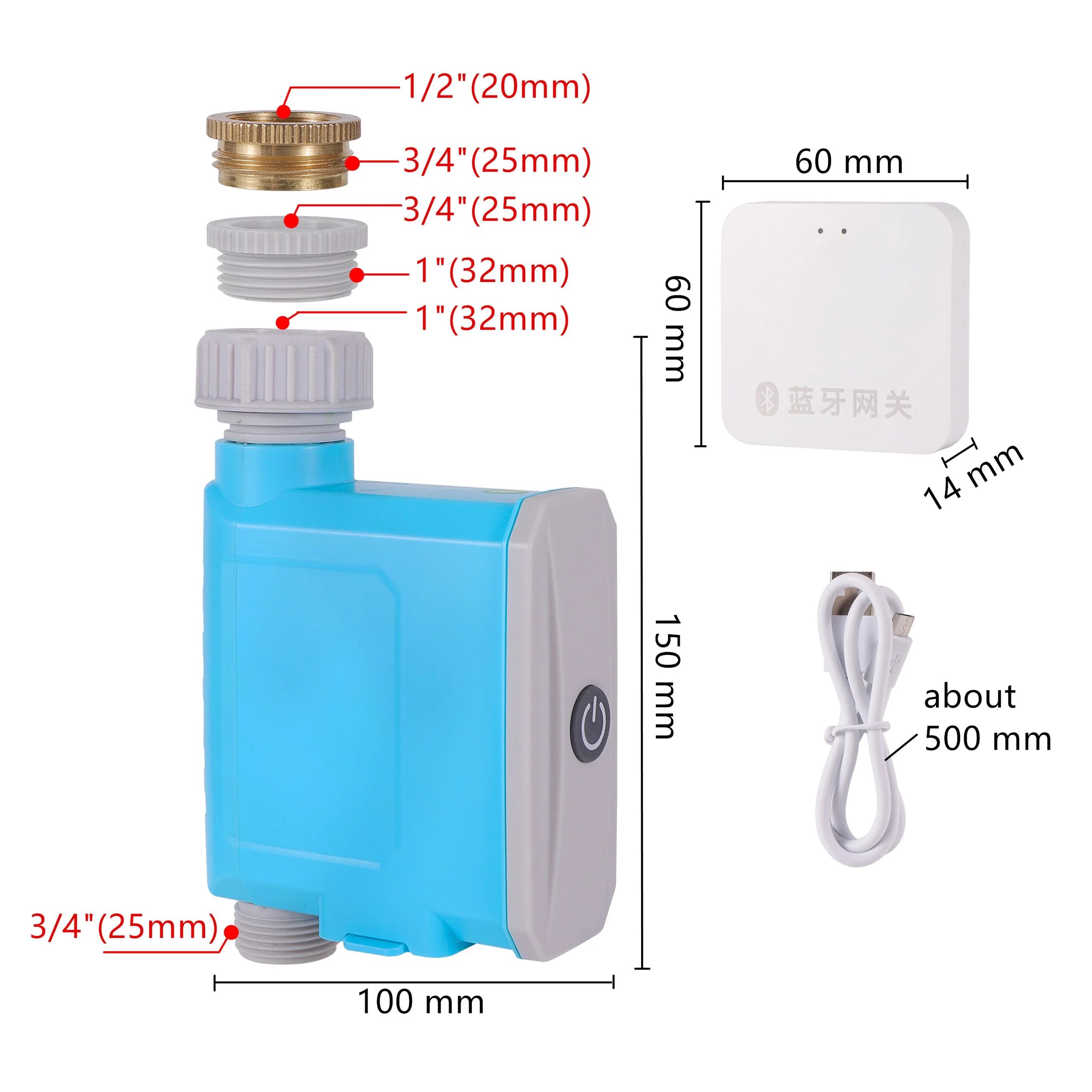 Puissance: <1w Accessoires: Les raccords supérieurs sont réduits de la femelle 1 « à 3/4 » à 1/2 « pour accueillir les robinets mâles de 1 » à 3/4 « à 1/2 » Le bas est un tuyau d’huile fileté mâle de 3/4 « , pour que vous puissiez faire correspondre le connecteur rapide ou différents raccords de tuyauterie, nous avons 4 raccords différents pour connecter un tuyau de 4/7mm, tuyau de 8/11mm ou tuyau de 16mm, si vous avez besoin, vous pouvez choisir d’acheter. Commutateur manuel: Appuyez sur le bouton de commutation du contrôleur et maintenez-le enfoncé pendant 5 secondes pour entrer en mode de configuration. Cliquez sur le bouton manuel pour contrôler la mise sous ou hors tension de l’appareil. Si l’appareil est en mode automatique, désactivez le commutateur manuel lors de l’arrosage. Appuyez sur le bouton de commutation et maintenez-le enfoncé pour réinitialiser et réassocier l’appareil. Après la réinitialisation, l’appareil est dans un état non lié. Feux de signalisation: A. Lorsque le Bluetooth est dans l’état de connexion de liaison, la lumière s’éteint après 3 secondes. B. Lorsque le Bluetooth est dans l’état d’être lié et non connecté, il clignote 3 fois par seconde. C. Lorsque le Bluetooth est à l’état non lié et non connecté, il clignote 9 fois. Remarque: Si le téléphone mobile Bluetooth est connecté à d’autres appareils après avoir déconnecté l’appareil, il peut ne pas se connecter automatiquement à cet appareil, veuillez essayer de redémarrer le téléphone mobile Bluetooth. Astuce: L’appareil n’a pas la capacité de travailler à basse température et peut endommager la structure interne. Lorsque la température est inférieure à 0 ℃, veuillez le ramener à l’intérieur pour éviter d’endommager l’équipement et les tuyaux en cas de gel et de fissuration. Si l’appareil est bien configuré mais se déconnecte souvent, il est fort probable que la passerelle et le contrôleur Bluetooth soient trop loin ou qu’il y ait trop de murs, le signal est donc faible et ne peut pas être connecté. Conseil: lorsque la batterie est faible, l’appareil rappelle automatiquement à l’utilisateur de remplacer la batterie