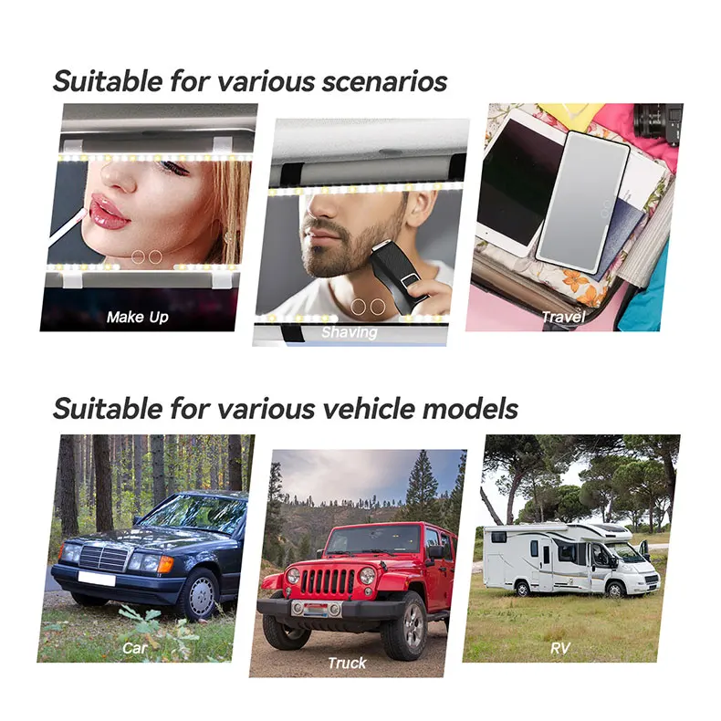 1. Miroir pare-soleil de voiture rechargeable: le miroir de courtoisie de voiture a une batterie intégrée, ce qui permet d’être utilisé sans souvent brancher le câble de charge.