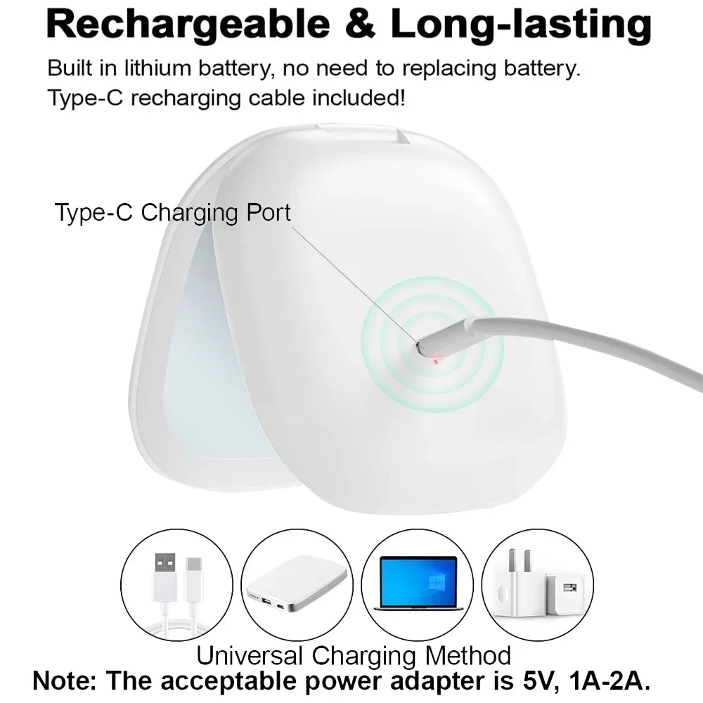 【Miroir compact rechargeable】 – Ce miroir dispose d’une grande batterie au lithium 400 MAH rechargeable USB Type-C intégrée.Même en mode luminosité maximale, il peut fournir jusqu’à 5 heures.Câble de recharge USB inclus!