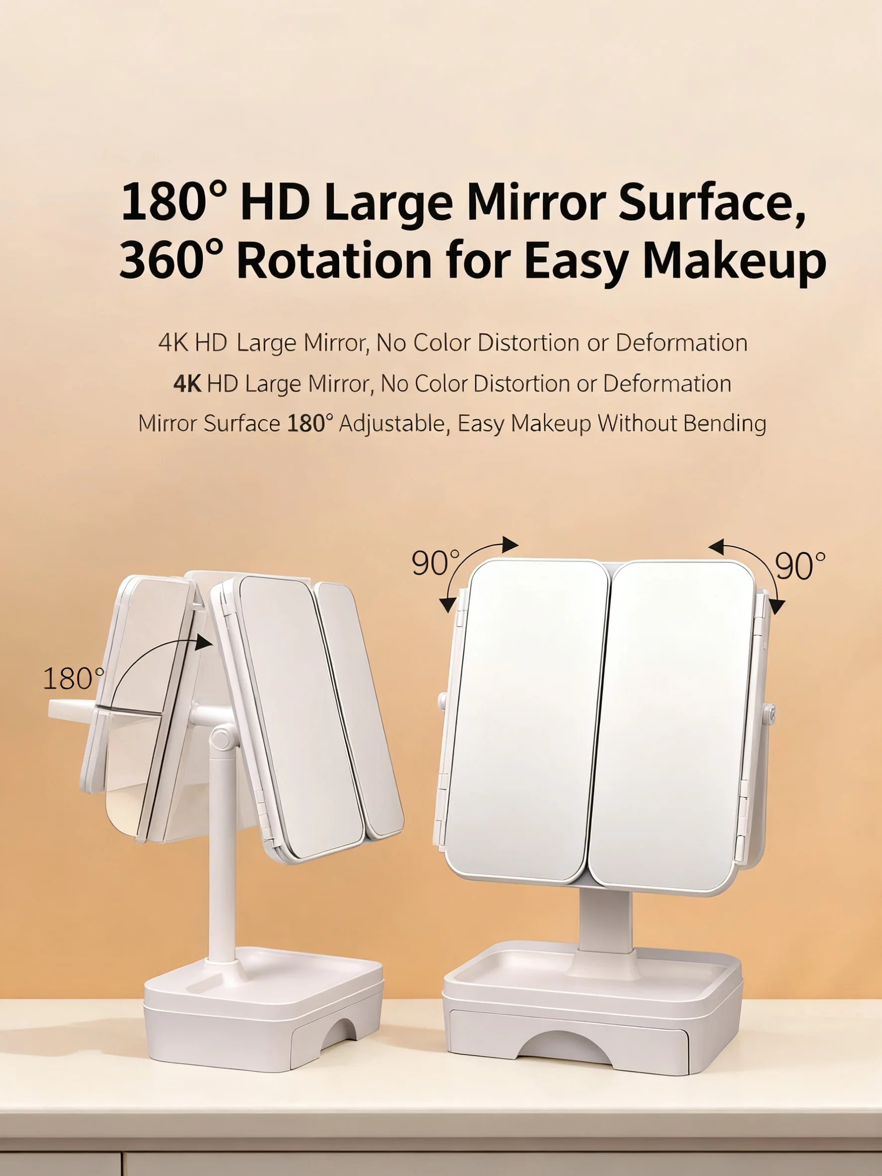 Miroir de maquillage éclairé par LED avec tiroir de rangement, 180 ° Grande surface miroir rotative et réglable en hauteur et haute définition