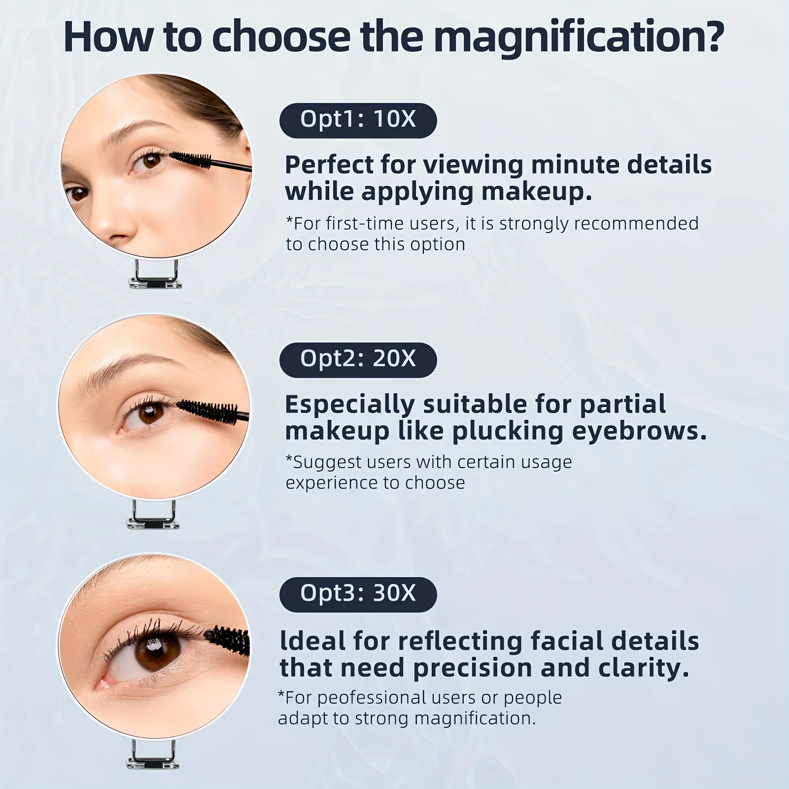 options d’utilisation polyvalentes, notamment la fixation à un miroir plat ou l’utilisation comme miroir à main.