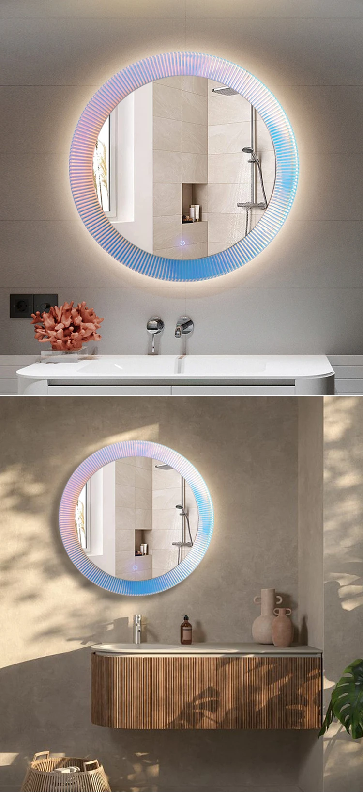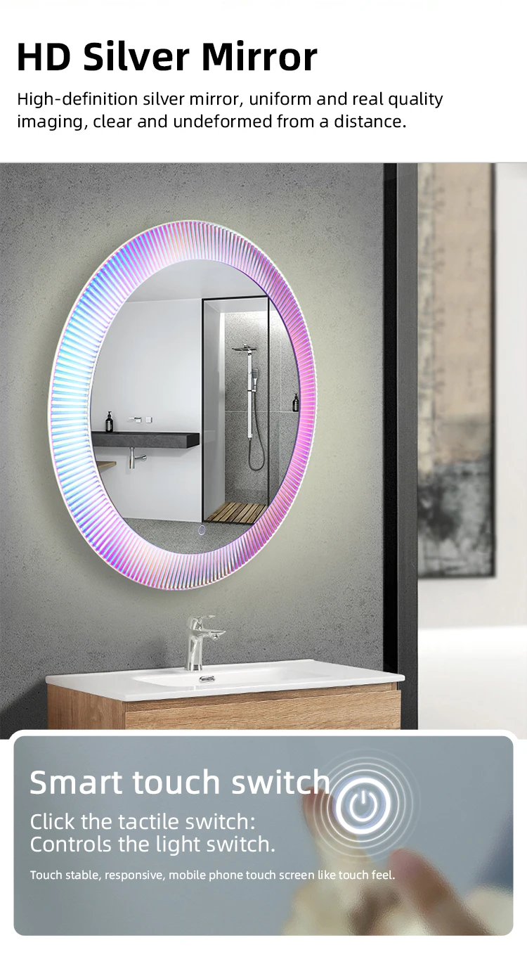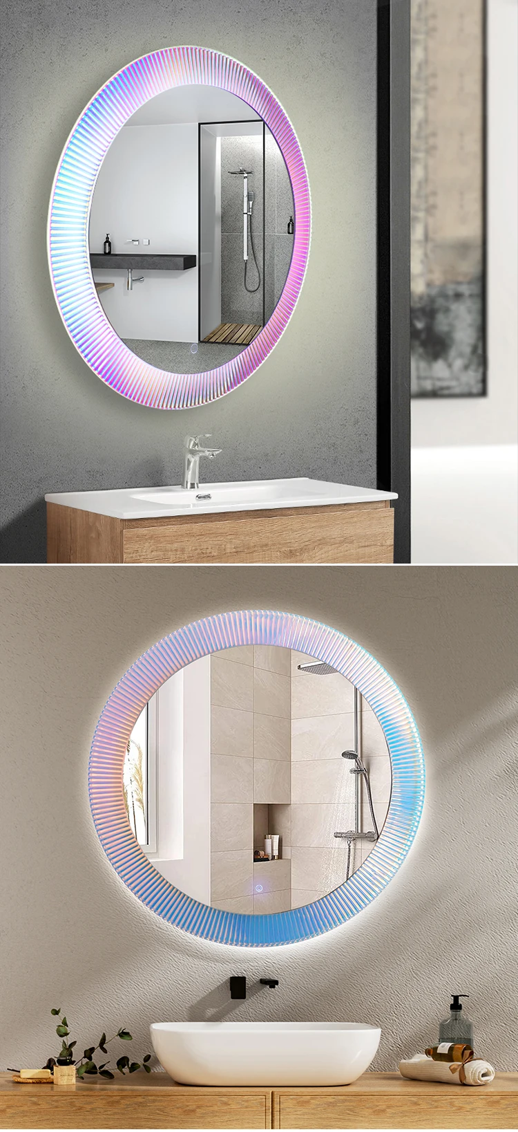 miroir mural rond verre cadre cannelé prismatique éclairage LED périphérique multicolore halo irisé rose bleu design contemporain commande tactile intégrée