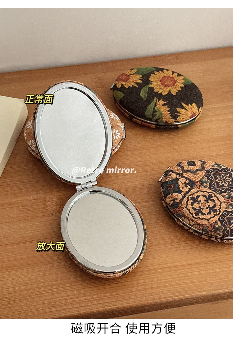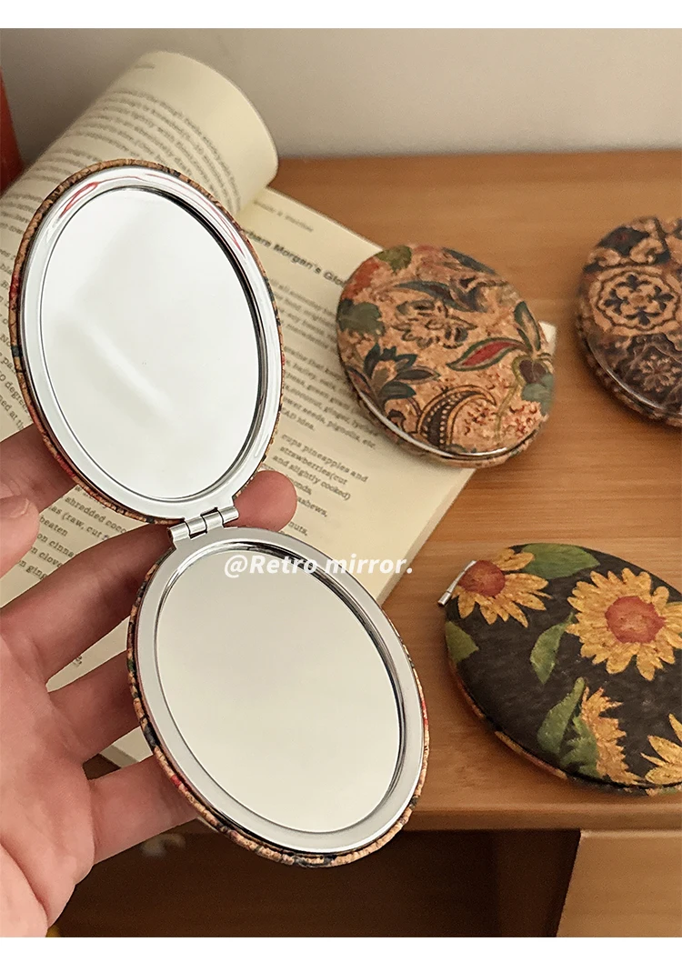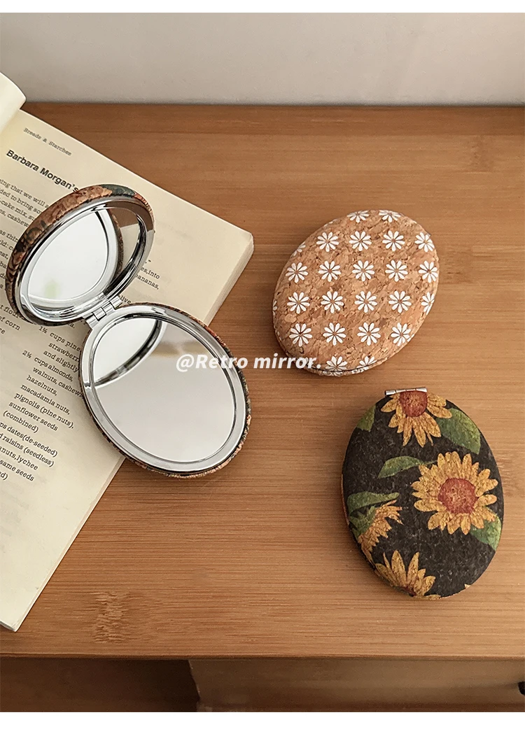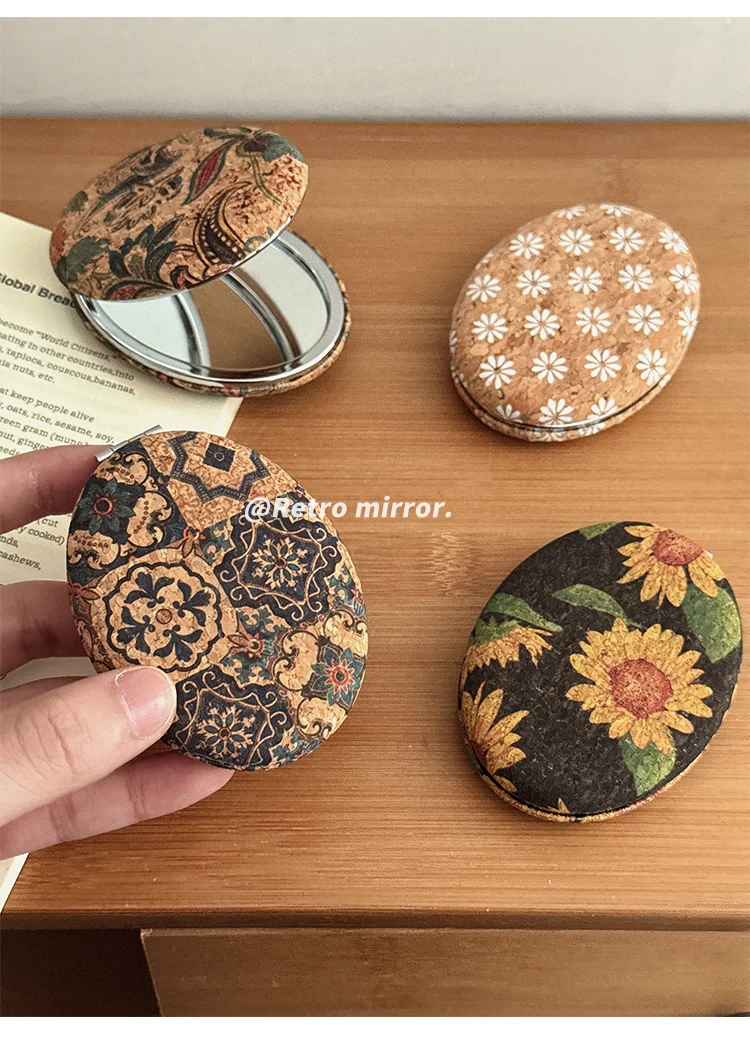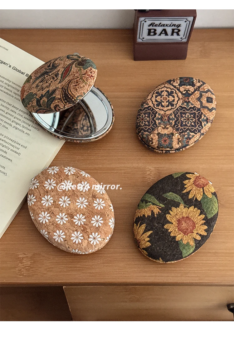 miroir poche ovale compact coque liège imprimé vintage fleurs tournesol mosaïque beige vert noir moutarde double grossissant argenté