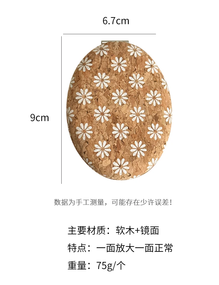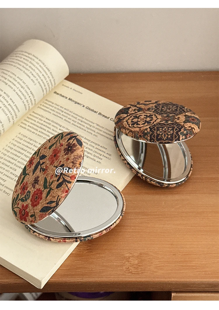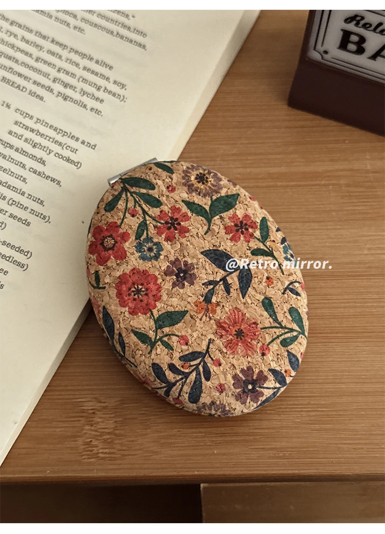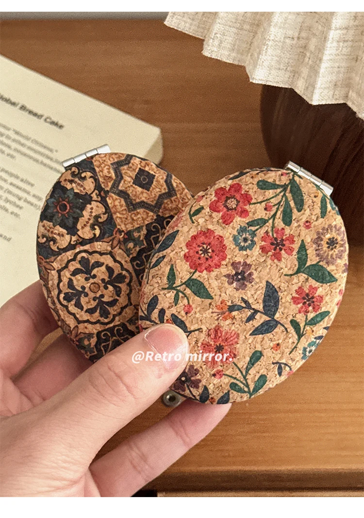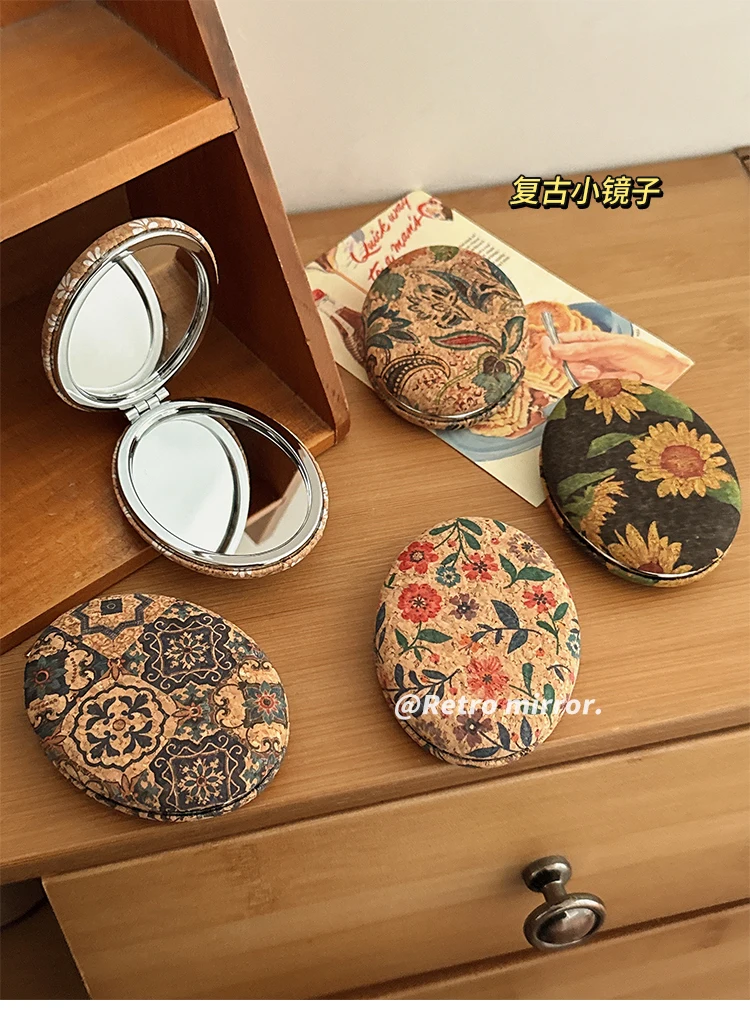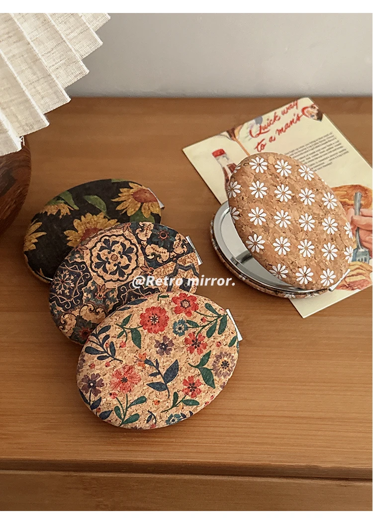 miroir poche ovale compact coque liège imprimé vintage fleurs tournesol mosaïque beige vert noir moutarde double grossissant argenté