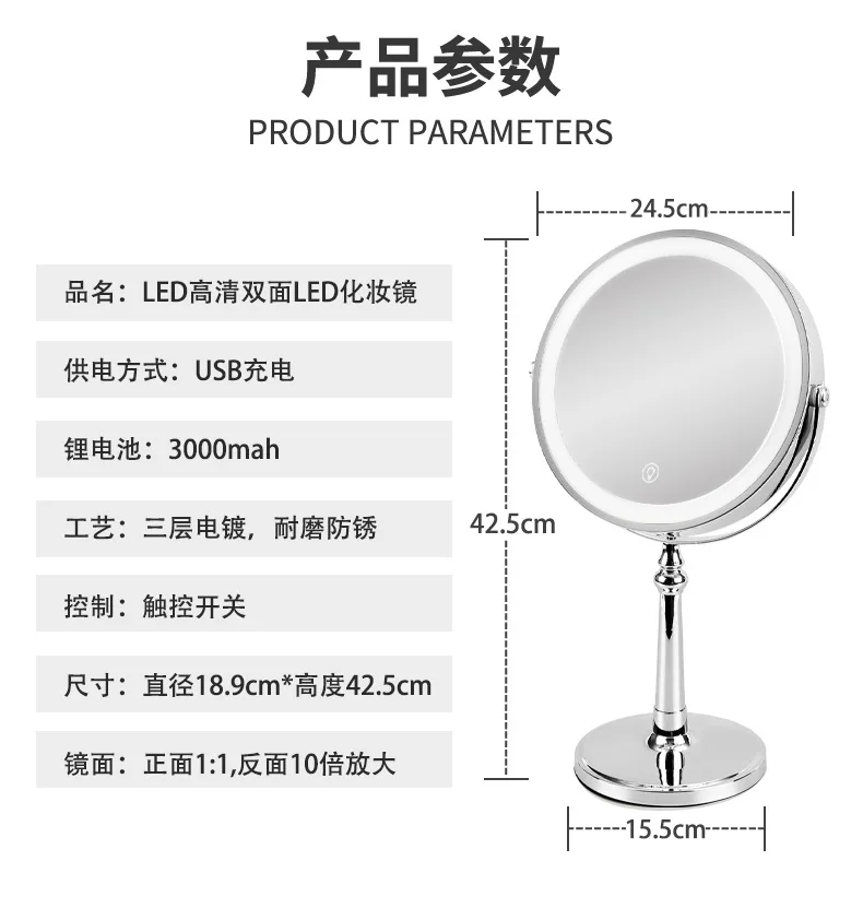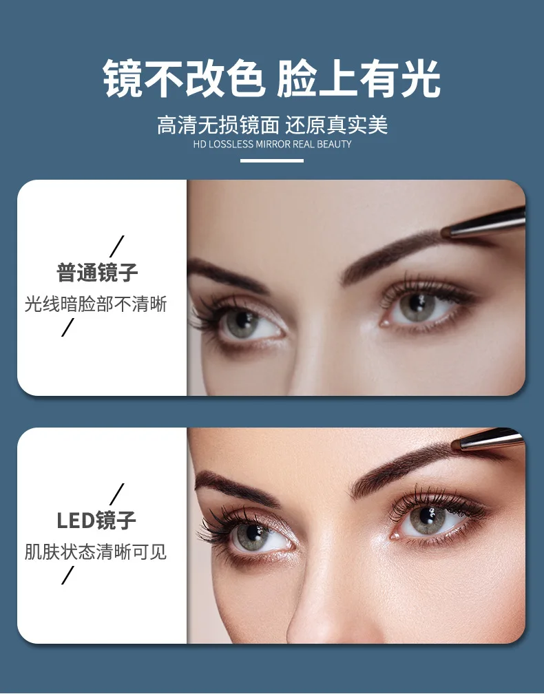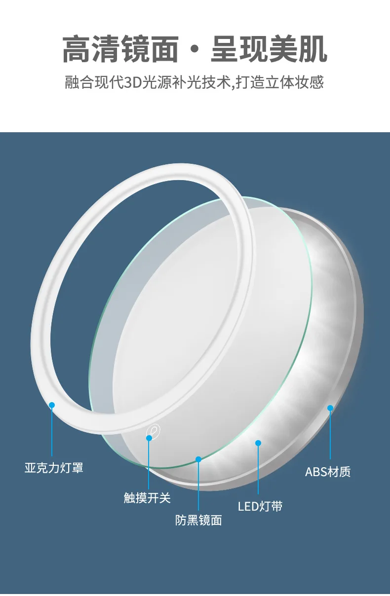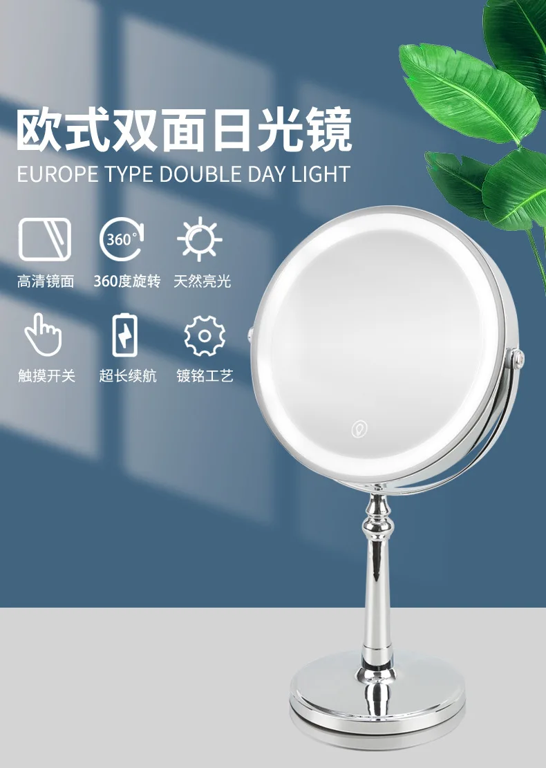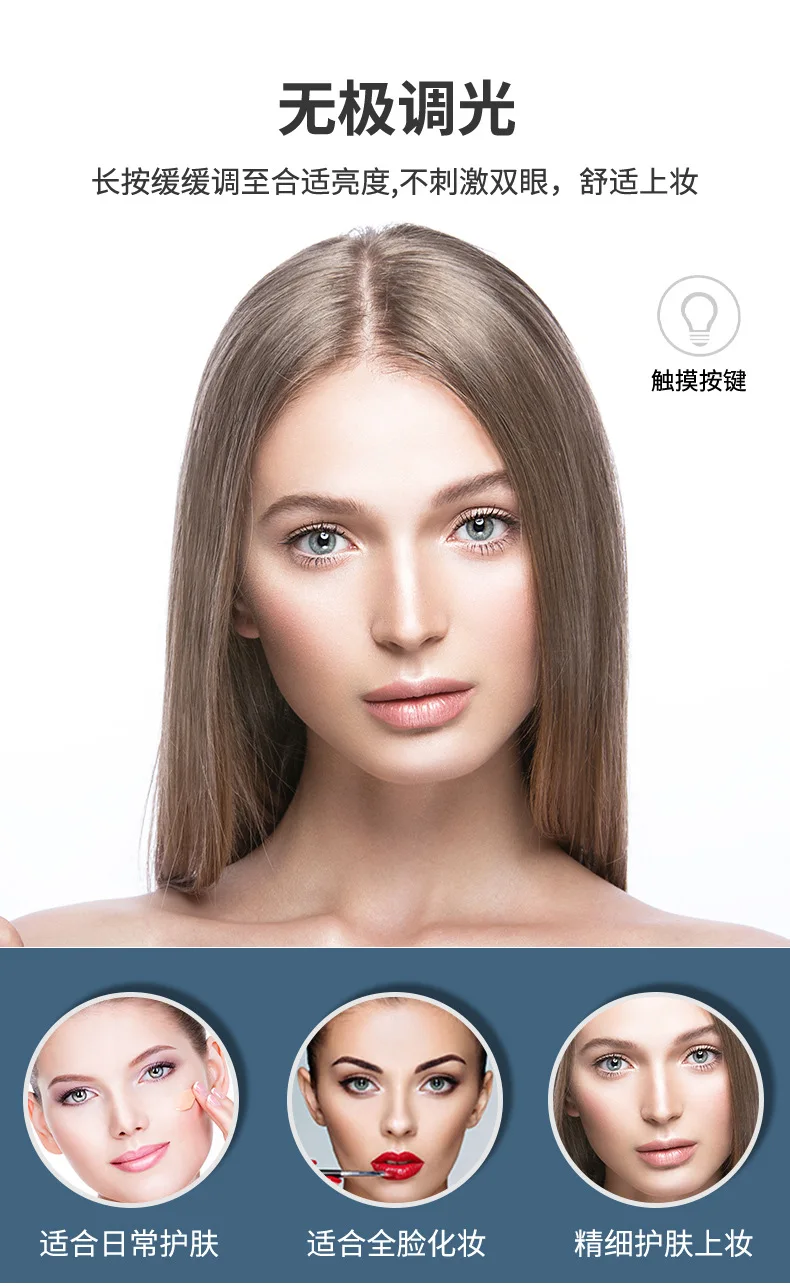 Double miroirs, 360 ° rotation, interrupteur à écran tactile, lumière tricolore, appuyez longuement sur la puissance pour régler la luminosité