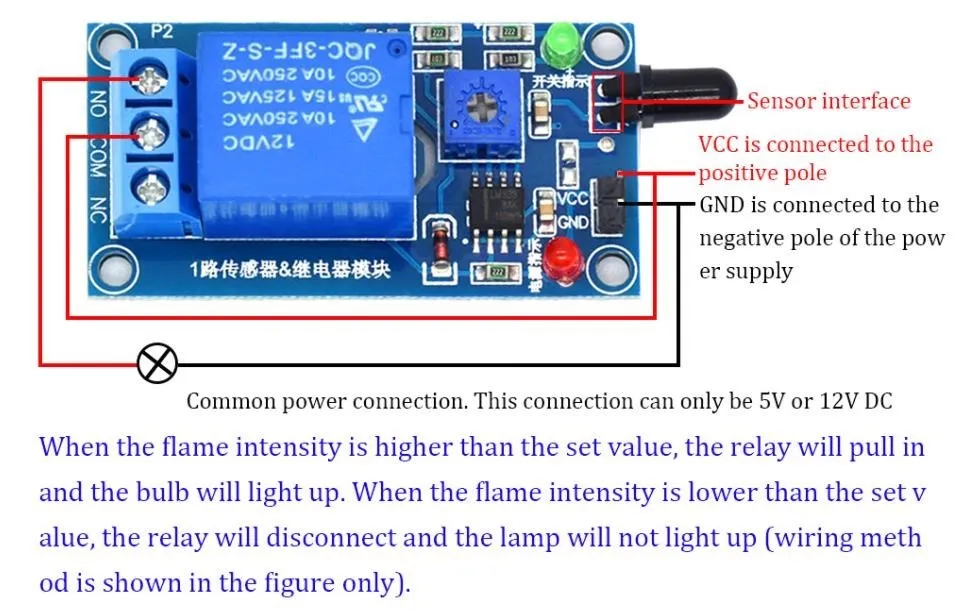 2.En ajustant le potentiomètre, l’intensité de la flamme induite par le capteur peut être réglée.Lorsque la flamme dépasse le seuil défini, le relais s’enclenche, l’extrémité commune est connectée à l’extrémité normalement ouverte, et lorsque la flamme est inférieure au seuil défini, le relais est éteint.L’extrémité commune est connectée à l’extrémité normalement fermée ;