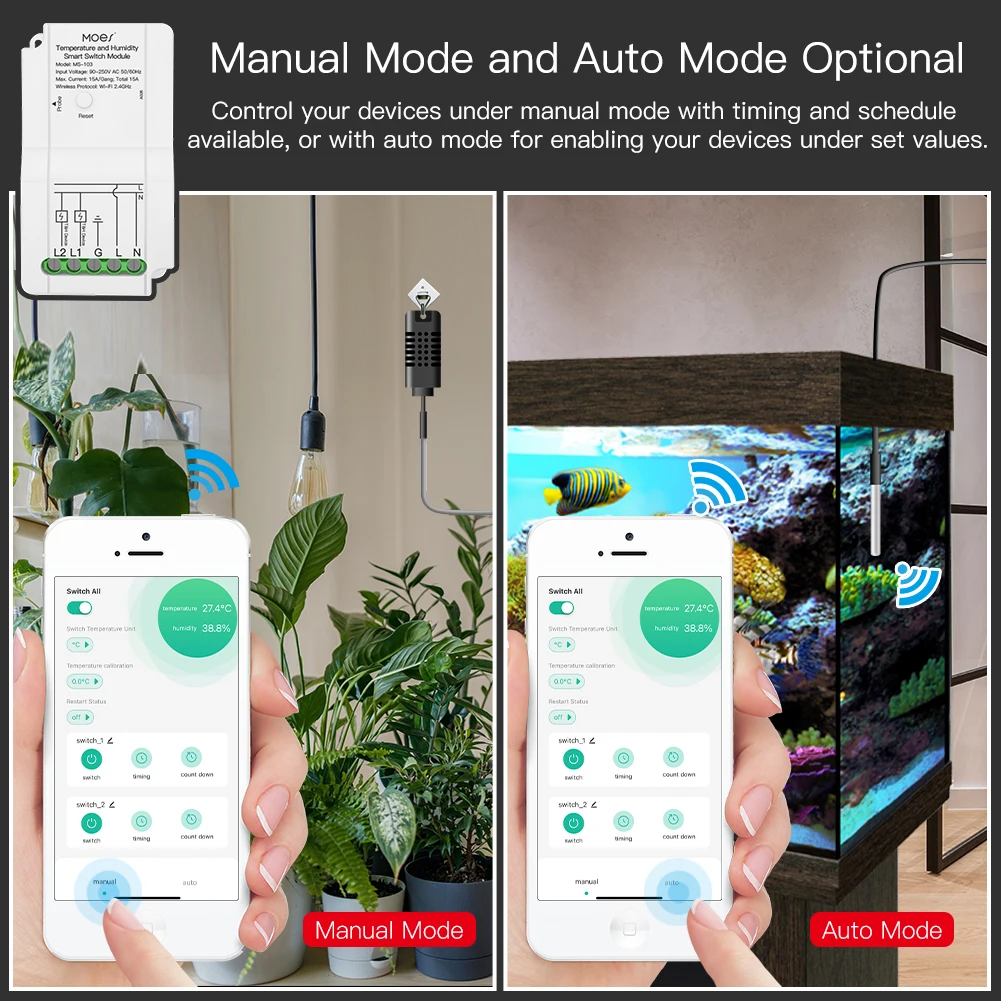 4.Les modes manuels et automatiques en option dans l’application permet d’une meilleure expérience utilisateur ;Minuteriez votre calendrier pour vos double interrupteurs avec support en circulation, ainsi que compte à rebours disponible ;Besides, définir les valeurs automatiques sous le mode automatique avec des modes de contrôle indépendants de la température et de l’humidité comme on/off automatiquement le dispositif de chauffage ou d’humidification pour maintenir l’environnement propre pour vos plantes ou les animaux.