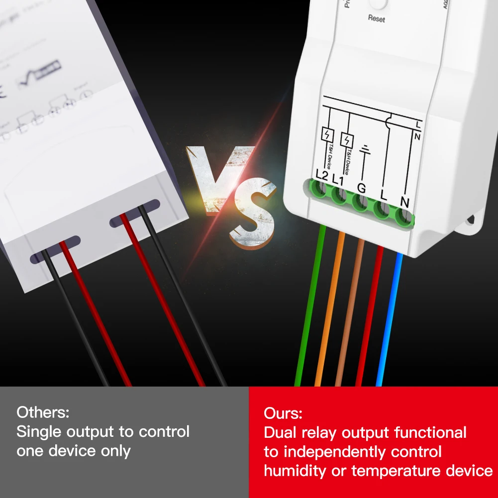 1.Un appareil intelligent extrêmement puissant avec un contrôleur de température et d’humidité à double sortie de relais est présenté comme le contrôle de la température et de l’humidité de l’environnement sous votre appareil connecté, capable de contrôler indépendamment deux appareils d’humidité ou de température différents pour un environnement beaucoup plus confortable pour l’alimentation des animaux ou l’entretien des équipements ;même se connecte directement aux équipements de réfrigération et de chauffage en même temps sur un mini module de commutation pour le contrôle marche/arrêt dans l’application Smart Life.