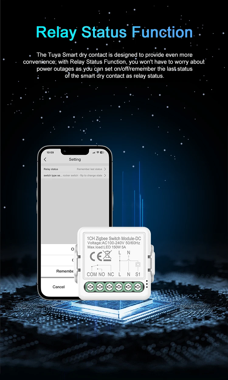 Avec fonction d’état de relais, vous ne vous inquiétez pas sur les pannes de puissance comme vous pouvant mettre/arrêt/remember la dernière état du contact sec intelligent comme statut de relais.