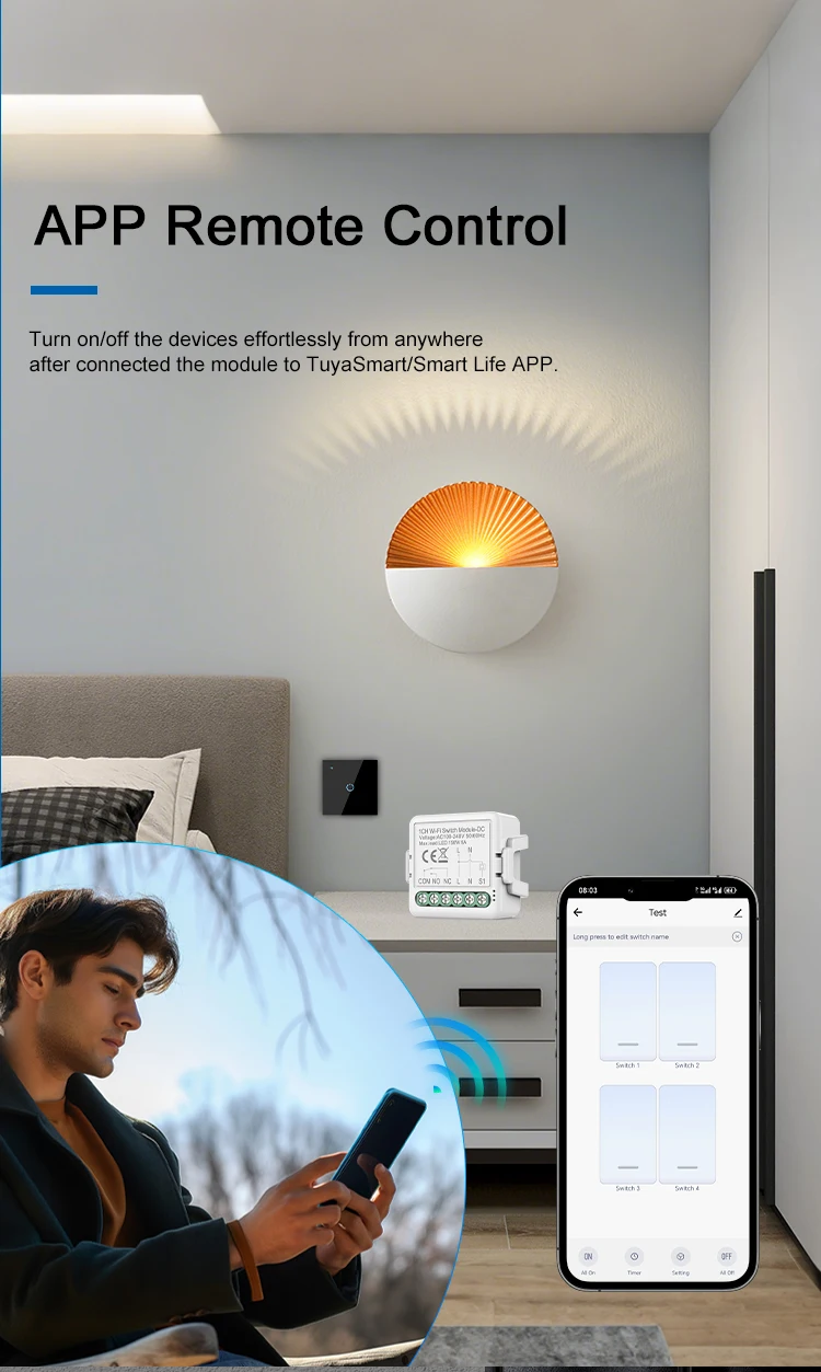 Allumez/éteignez les appareils sans effort de n’importe où après avoir connecté le module à l’application TuyaSmart/Smart Life.