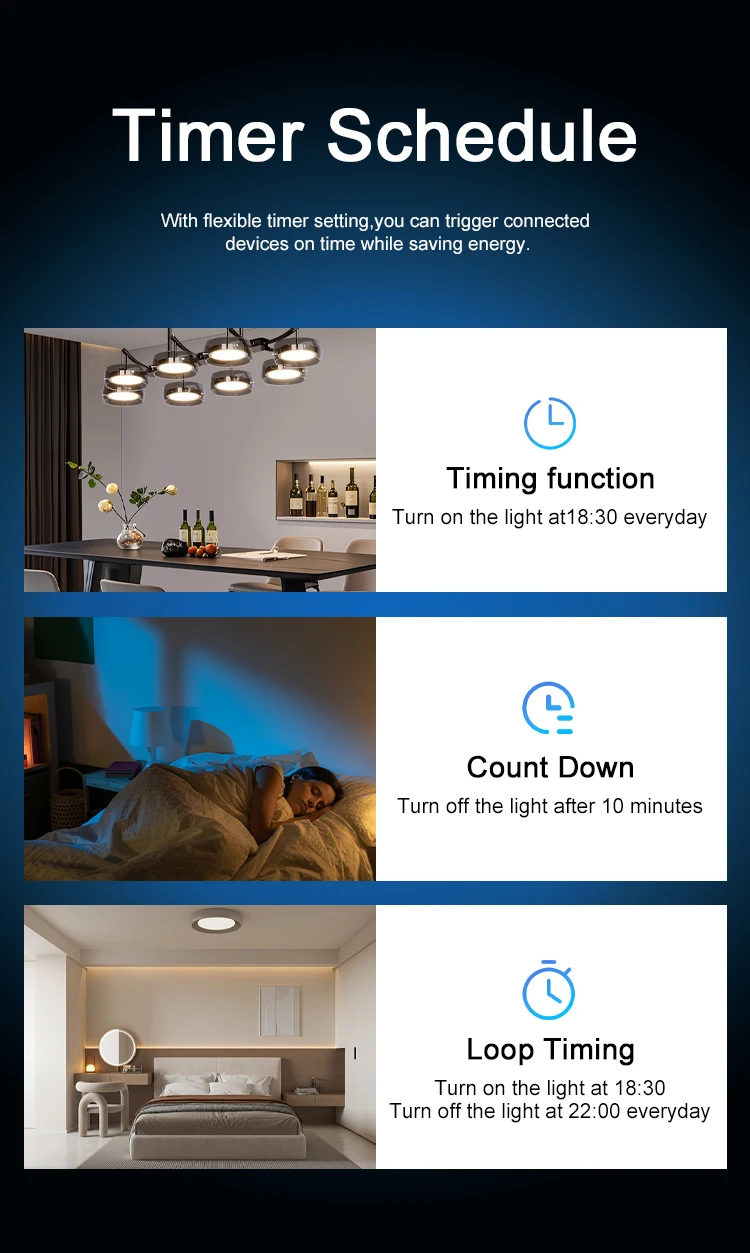 Avec réglage flexible du minuterie, vous pouvez déclencher les appareils connectés sur le temps pendant l’économie d’énergie.