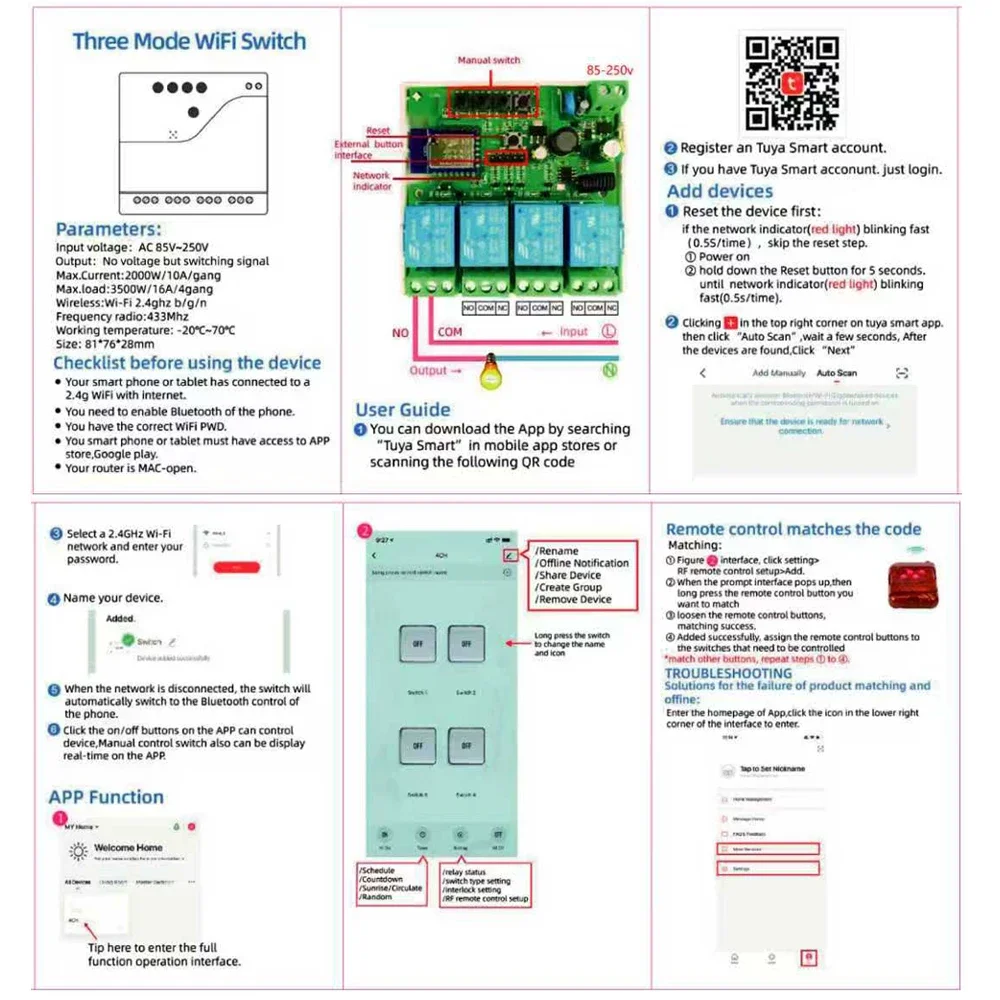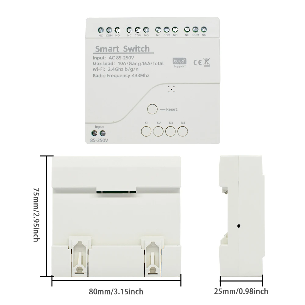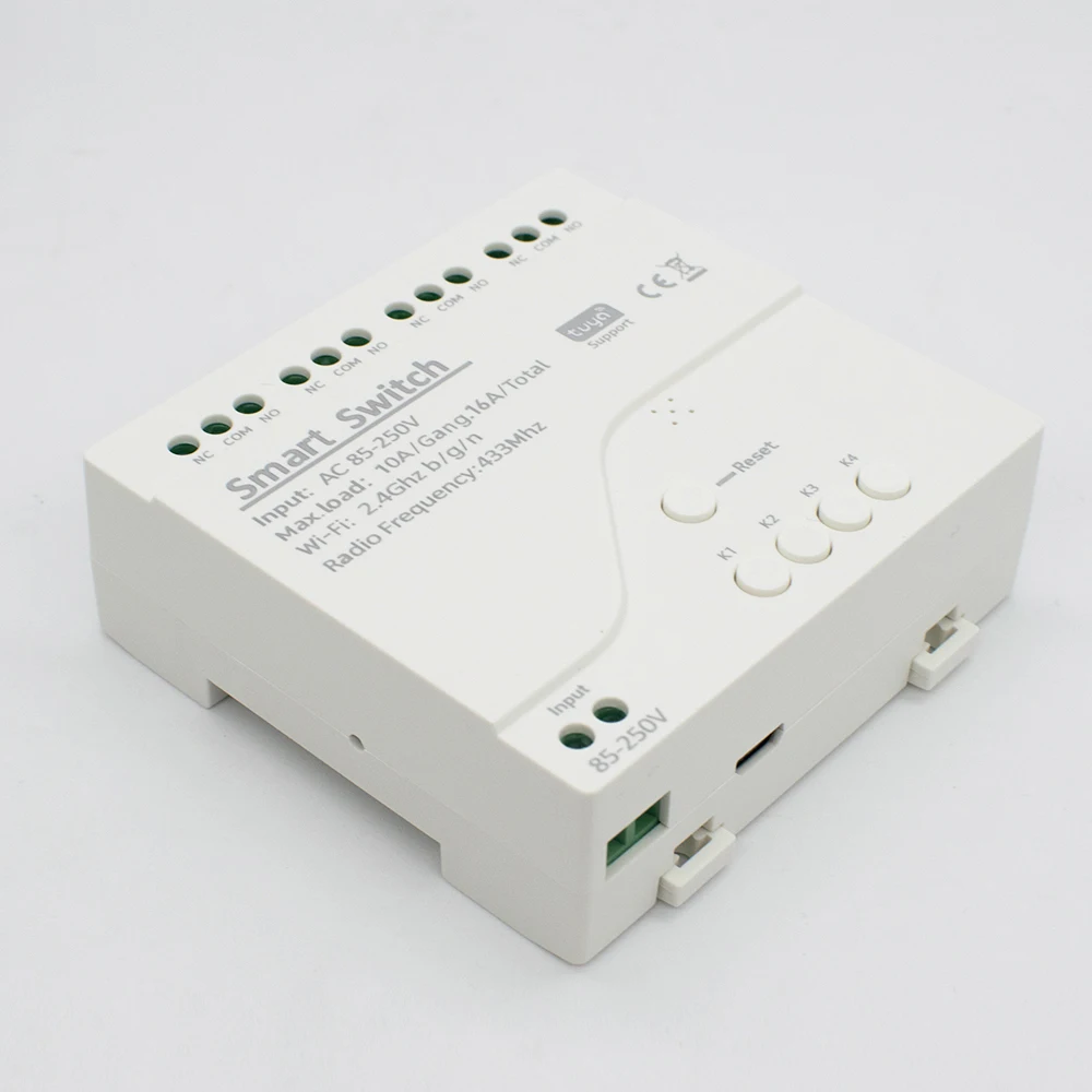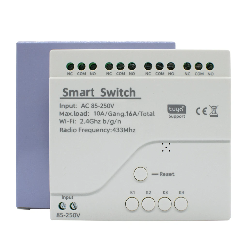 Ce produit est un commutateur intelligent sans fil WiFi universel à 4 canaux avec module RF 433 MHz, pour votre système de maison intelligente à distance et éteindre automatiquement les appareils électroménagers et les appareils électroniques par application téléphonique.Il peut également être contrôlé par une télécommande RF à l’intérieur.Il peut se connecter et contrôler quatre appareils sur l’application en même temps et vous pouvez l’allumer/d’arrêt indépendamment ciascun des quatre gangs.Il prend également prend en charge la synchronisation marche/arrêt des appareils à un temps spécifié et partagez aux autres ainsi que vous pouvant contrôler votre maison intelligente ensemble avec votre famille.Vous pouvez également contrôler la voix de vos appareils électroménagers par Amazon Alexa, et pour Google Home/Nest,IFTTT et profitez de vie intelligente et faites votre maison plus intelligente.