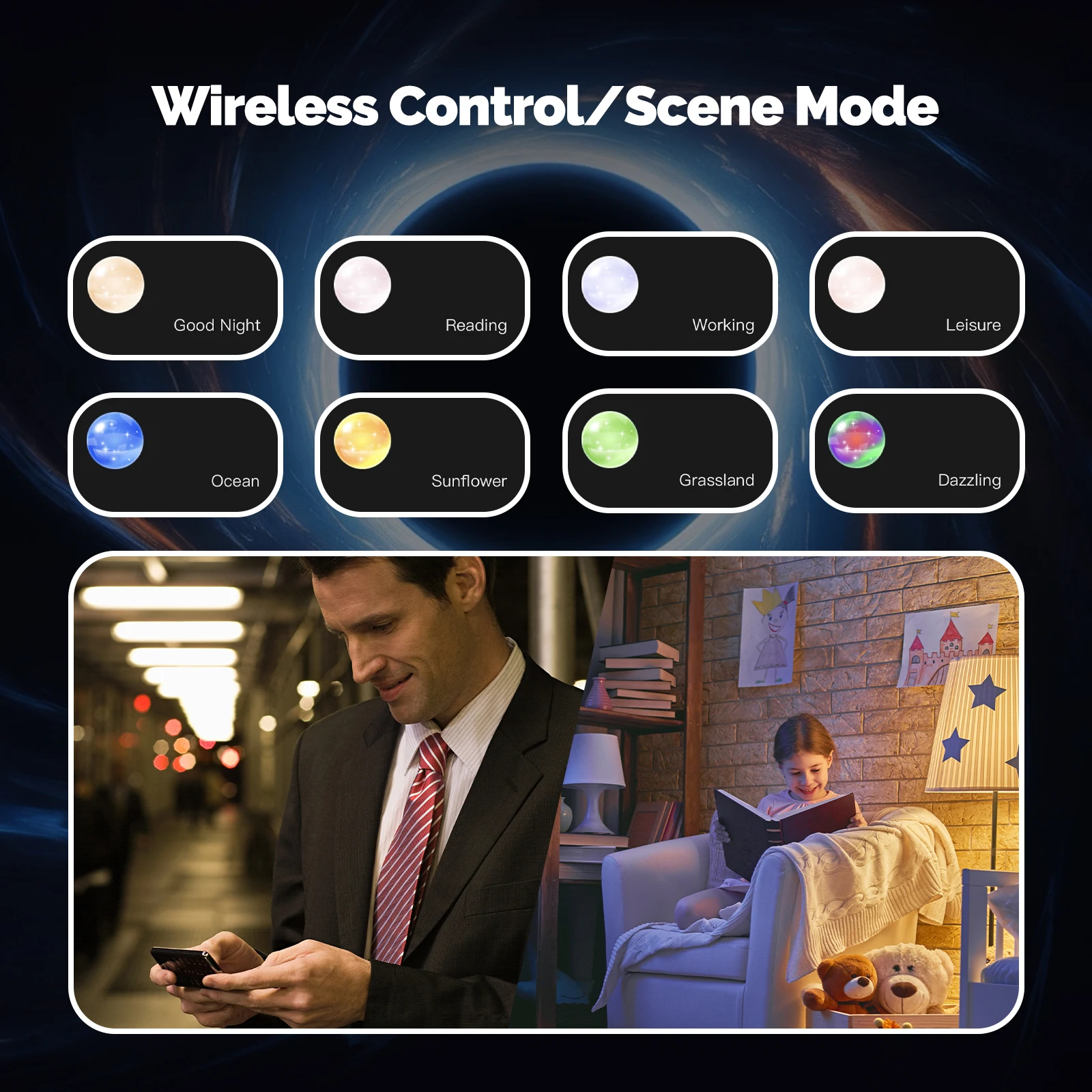 Pas de matière à la maison ou à l’extérieur, vous pouvez contrôler les lumières de la maison à travers le téléphone portable, le mode de scène, peut également ajuster ou changer les lumières de la maison à l’extérieur.