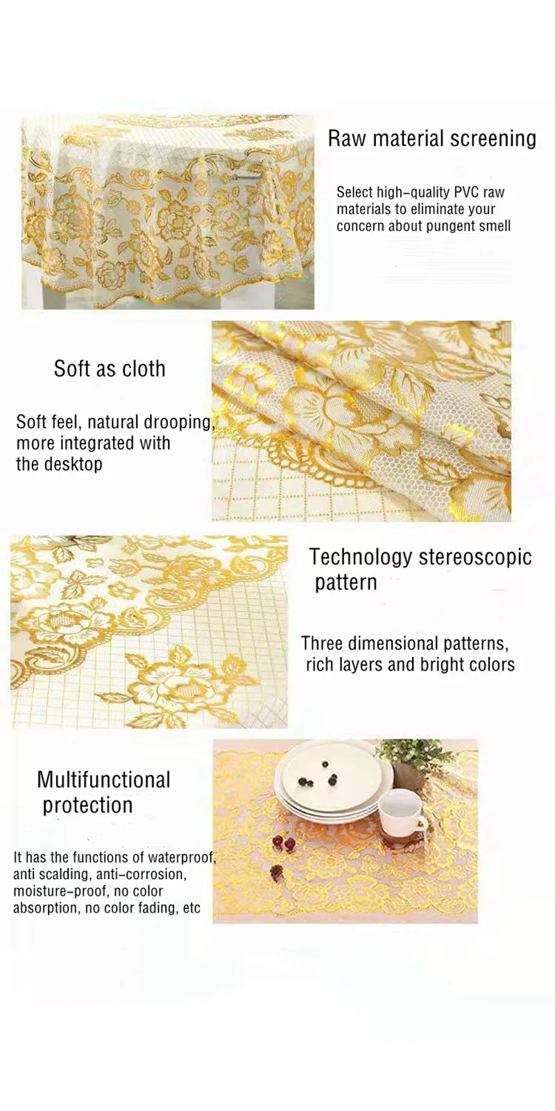 Remarque : Huile de fruits de mer (huile de crevette, huile de poisson), quelques sauces et pigments chauds ont une pénétration des couleurs et des effets corrosifs, qui peut conduire aux patchs de couleur résiduelle après le lavage de la nappe.