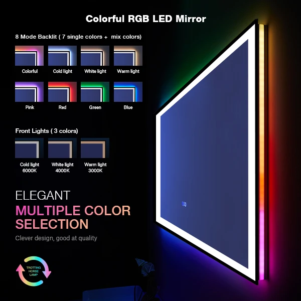 Nouveau miroir de lumière LED coloré rvb, miroir de salle de bains intelligent rétroéclairé mural avec fonction de mémoire Anti-buée à intensité variable