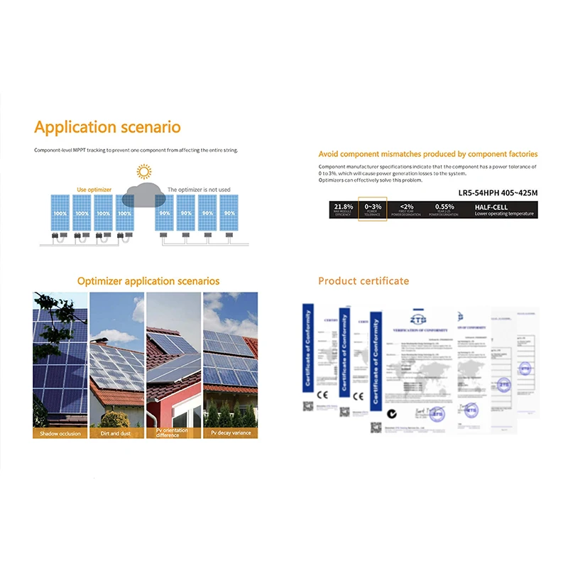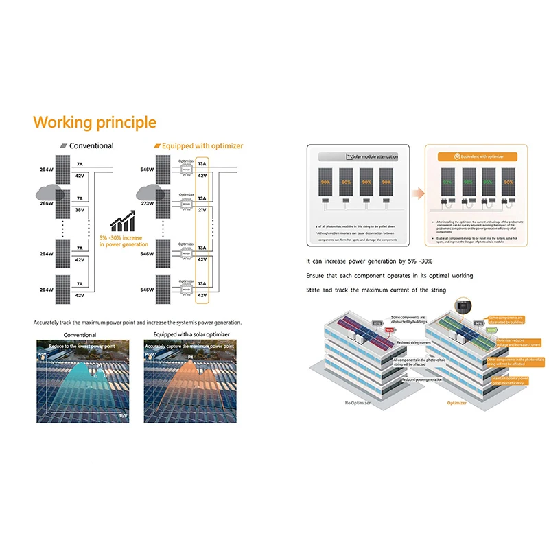 [lmprove Efficacité] Les optimiseurs solaires sont principalement utilisés pour optimiser la puissance de sortie des panneaux solaires photovoltaïques pour garantir que le système peut fonctionner l’efficacité anaximum.L’optimiseur solaire peut augmenter manière significative la production d’énergie du système par 5-25%