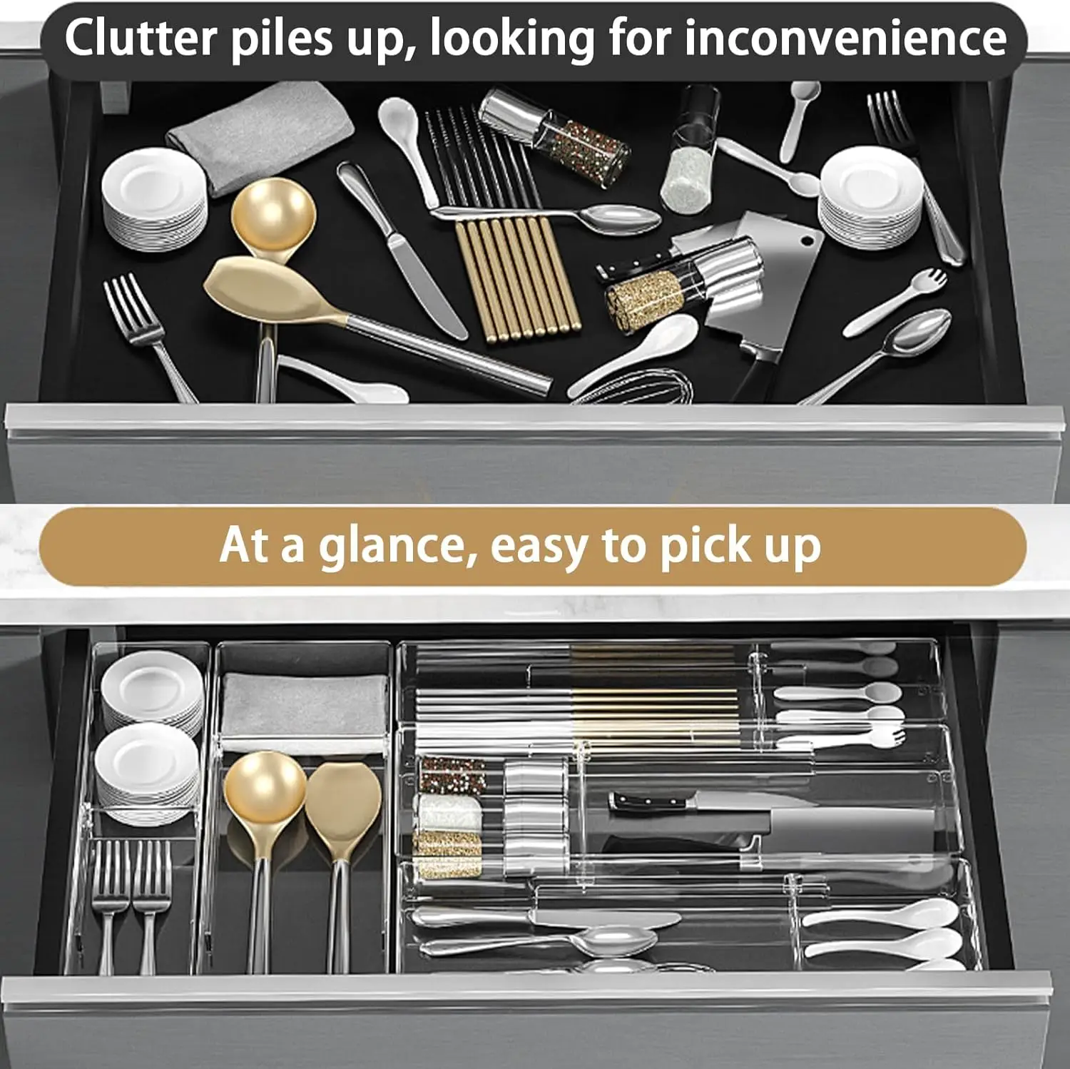 【Taille parfaite】 notre organisateur d’ustensiles s’adapte aux tiroirs standard et de petite taille. La sa profondeur vous permet de stocker des ustensiles multiples dans un seul compartiment sans vous inquiétez pas des enchères.