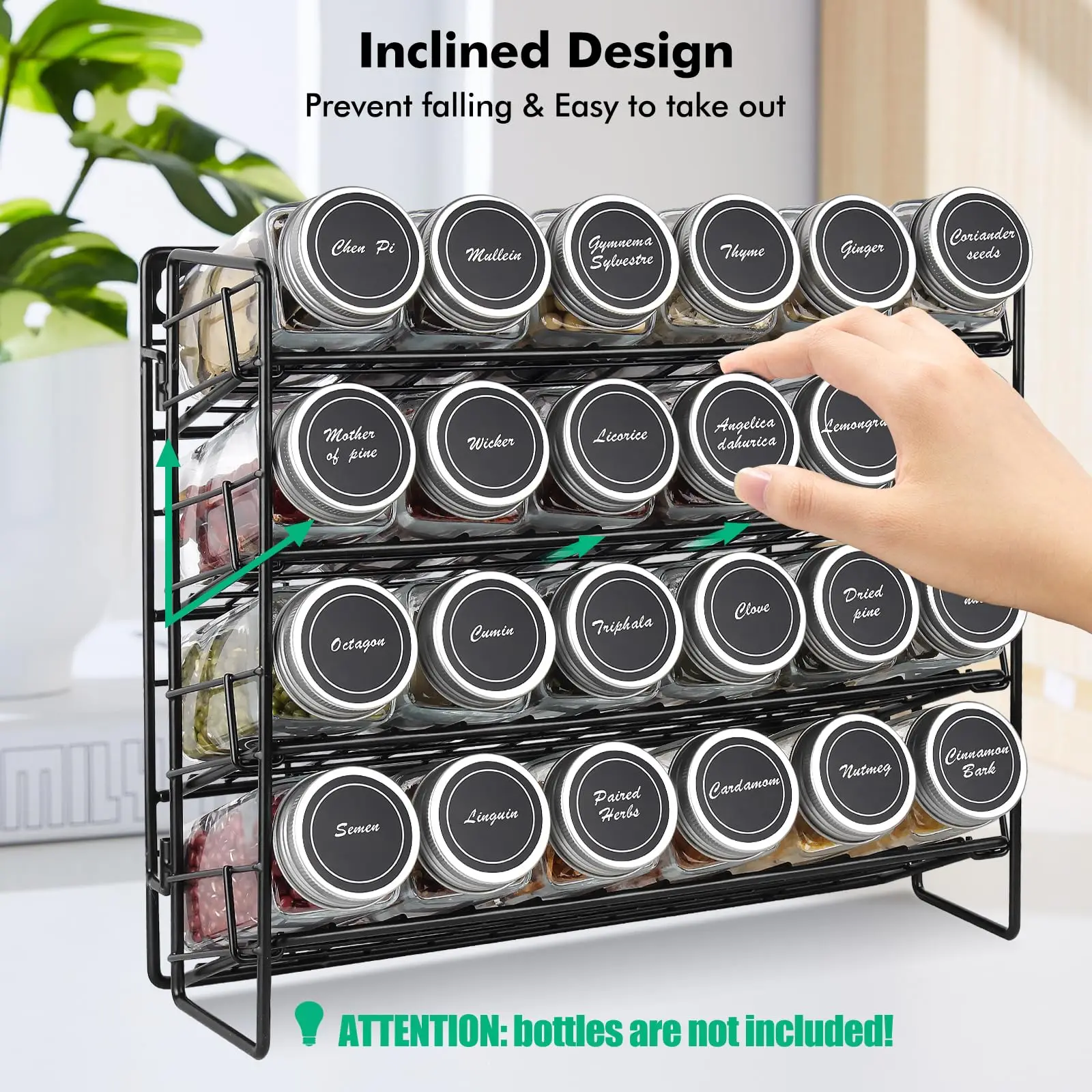 Cet organisateur d’épices au design incliné vous permet de voir ce qu’il contient dans le support d’assaisonnement à épices même s’il est placé en hauteur.La base élargie stable avec une conception triangulaire augmente la stabilité et vous permet de mettre ou de retirer facilement la bouteille d’épices.