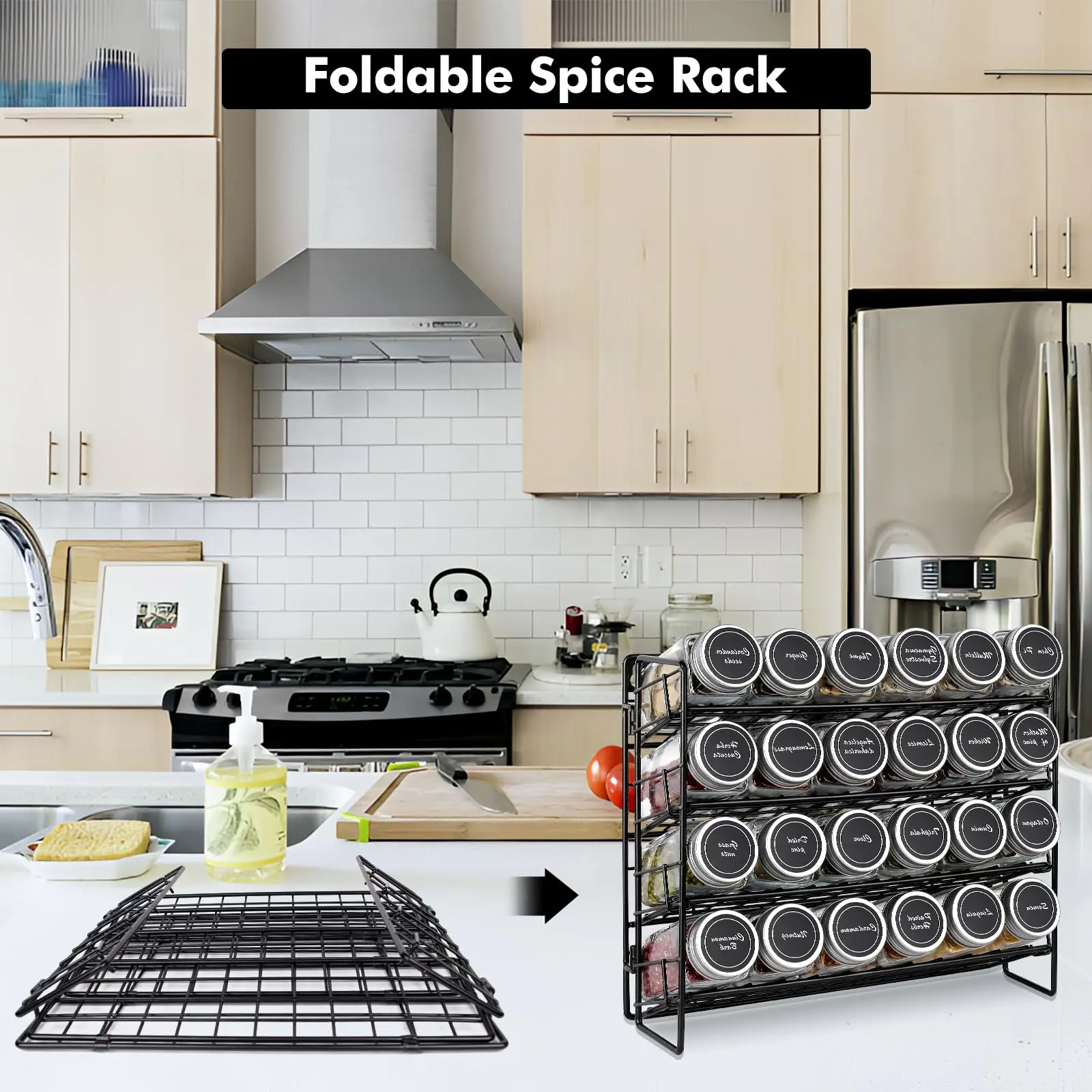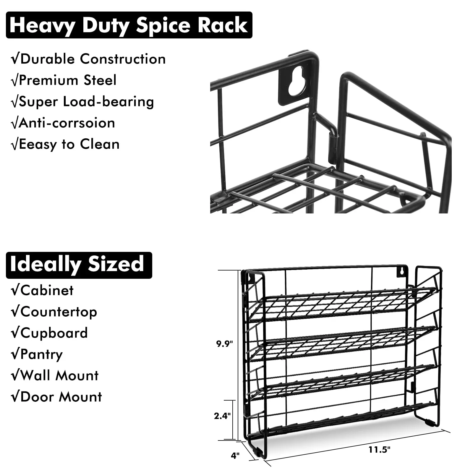 Porte-épices mural sans perçage.Le porte-épices suspendu en plus d’un support gratuit dans un meuble, sur la table de cuisine, dans la salle de bain ou le garde-manger, peut également être accroché sur le côté du réfrigérateur, au mur, partout qui fait sens.Un grand économiseur d’espace.
