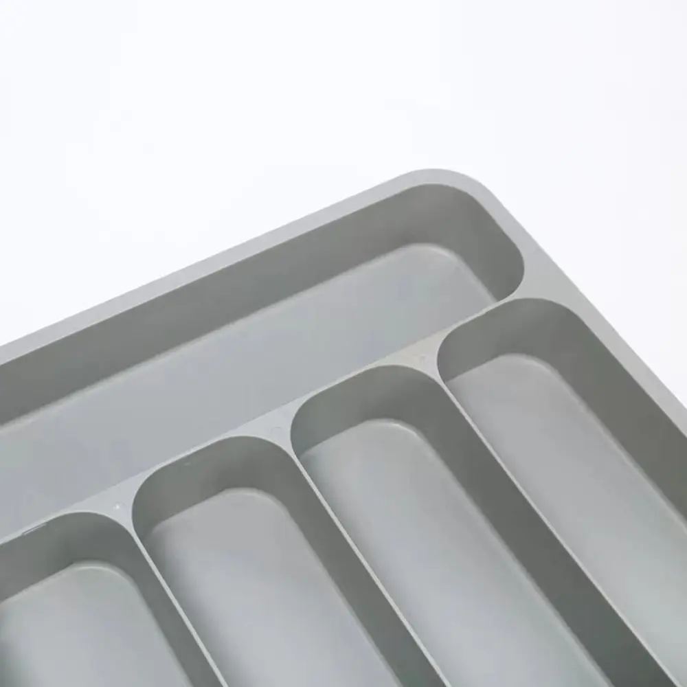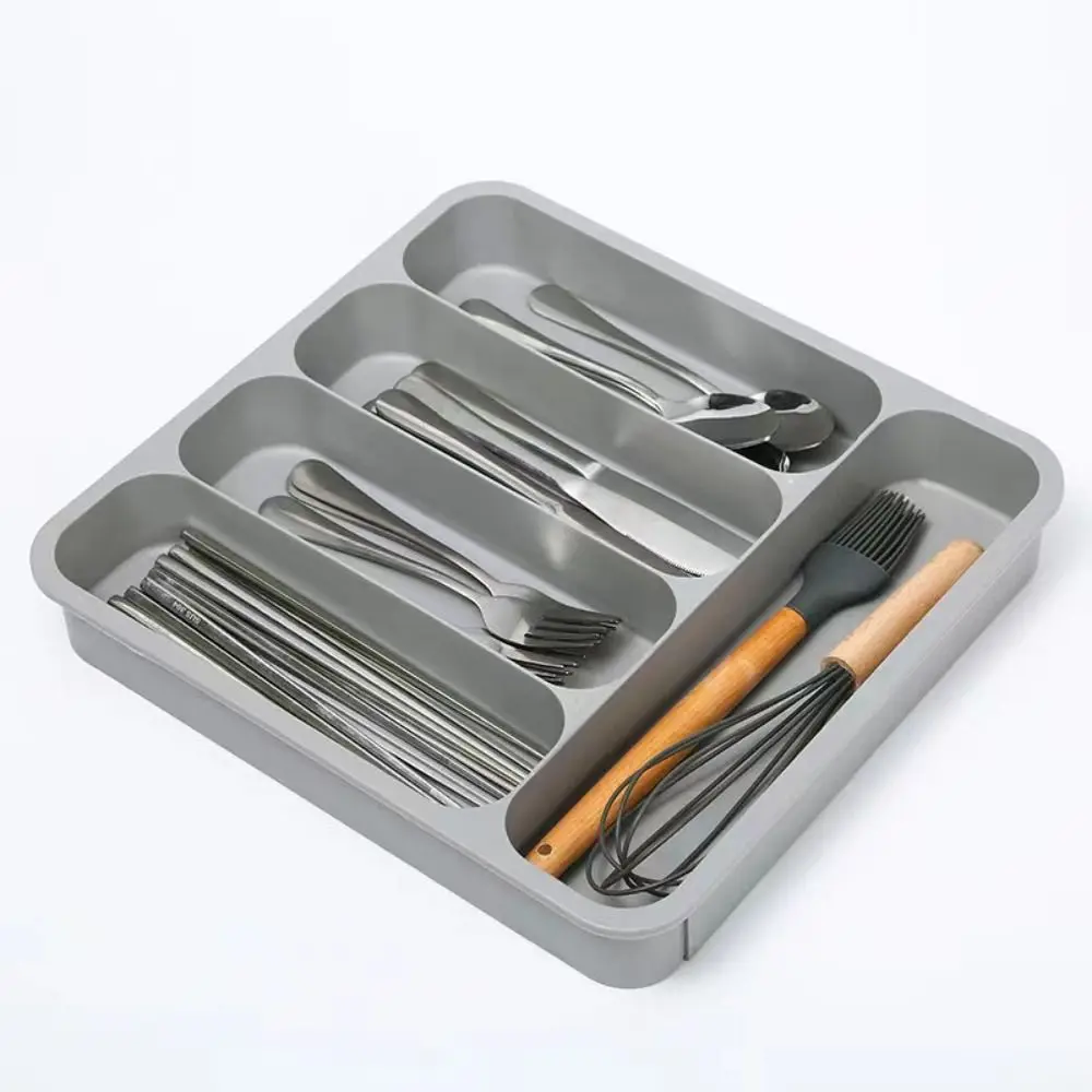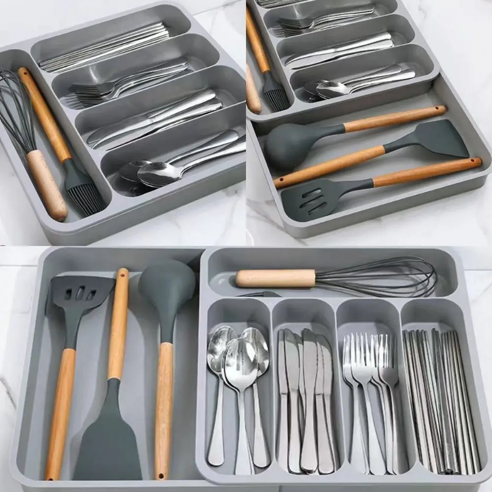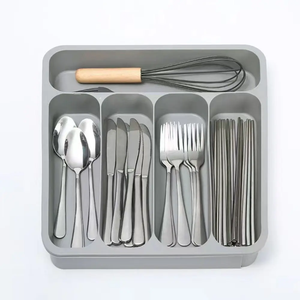 With 6 compartments, our large adjustable utensil silverware tray helps you maximize the use of your kitchen drawers. 4 small slots, 1 medium slot, and 1 expandable large slots on sides for store spoon, fork and other kitchen props.