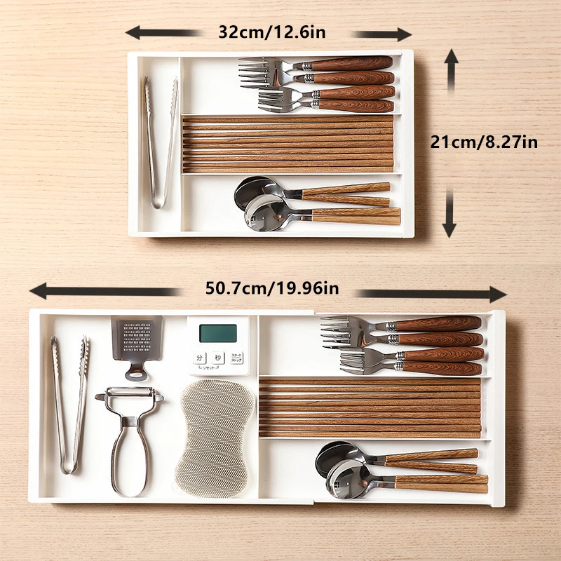 Boîte de rangement polyvalente mesurant 32*21*3 cm, avec une longueur rétractable de 32 à 50,7 cm, garantissant la compatibilité avec différents tailles de tiroirs.