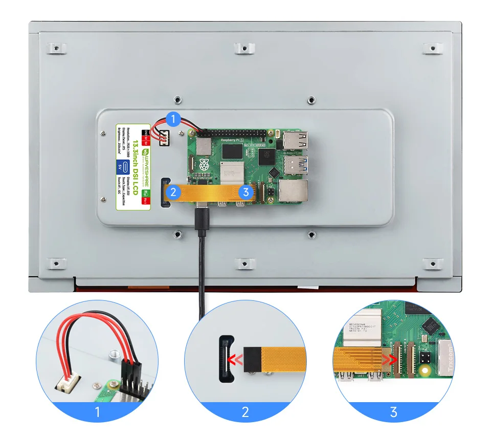 Veuillez connecter le câble DSI comme indiqué dessus et charger l’écran LCD à travers le broche GPIO 5V